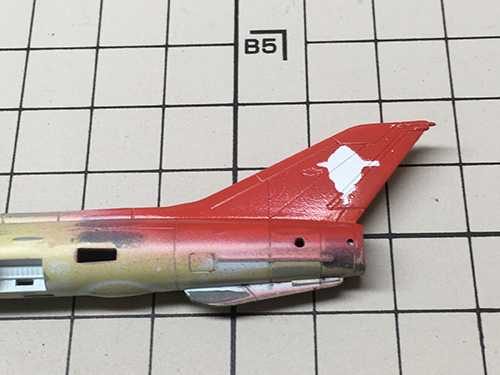 ラベルが翼の出っ張りに追従しないと思うので、以前制作した 東ドイツ機 のマークと同じ大きさにして出っ張りを避けて貼り付けました。