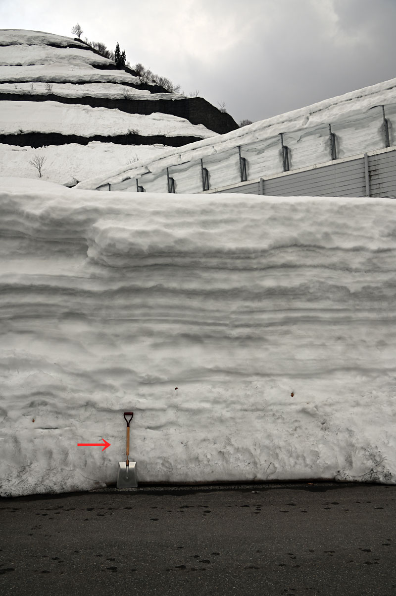 ↑ちょうど車にスタックした時の脱出用にスコップを積んでいたので(←冬は常備品)それを立ててみました。スコップは長さは108cm。それからすればここの積雪は4mはあると思われます。