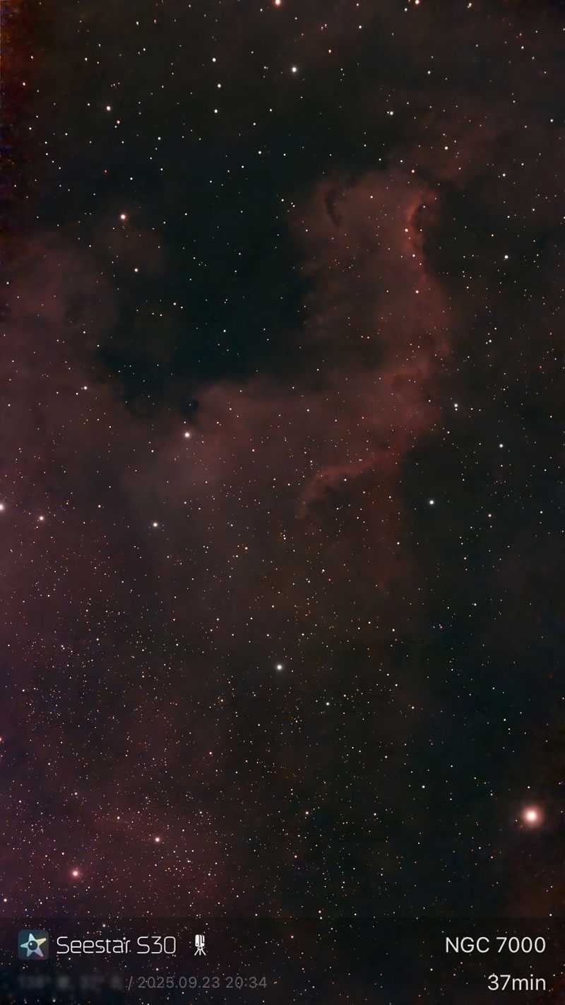 SeestarをNGC7000北アメリカ星雲に向けると、星雲の中心部を中央に持ってくるようで特徴的なメキシコ湾の形がうまく写りません。