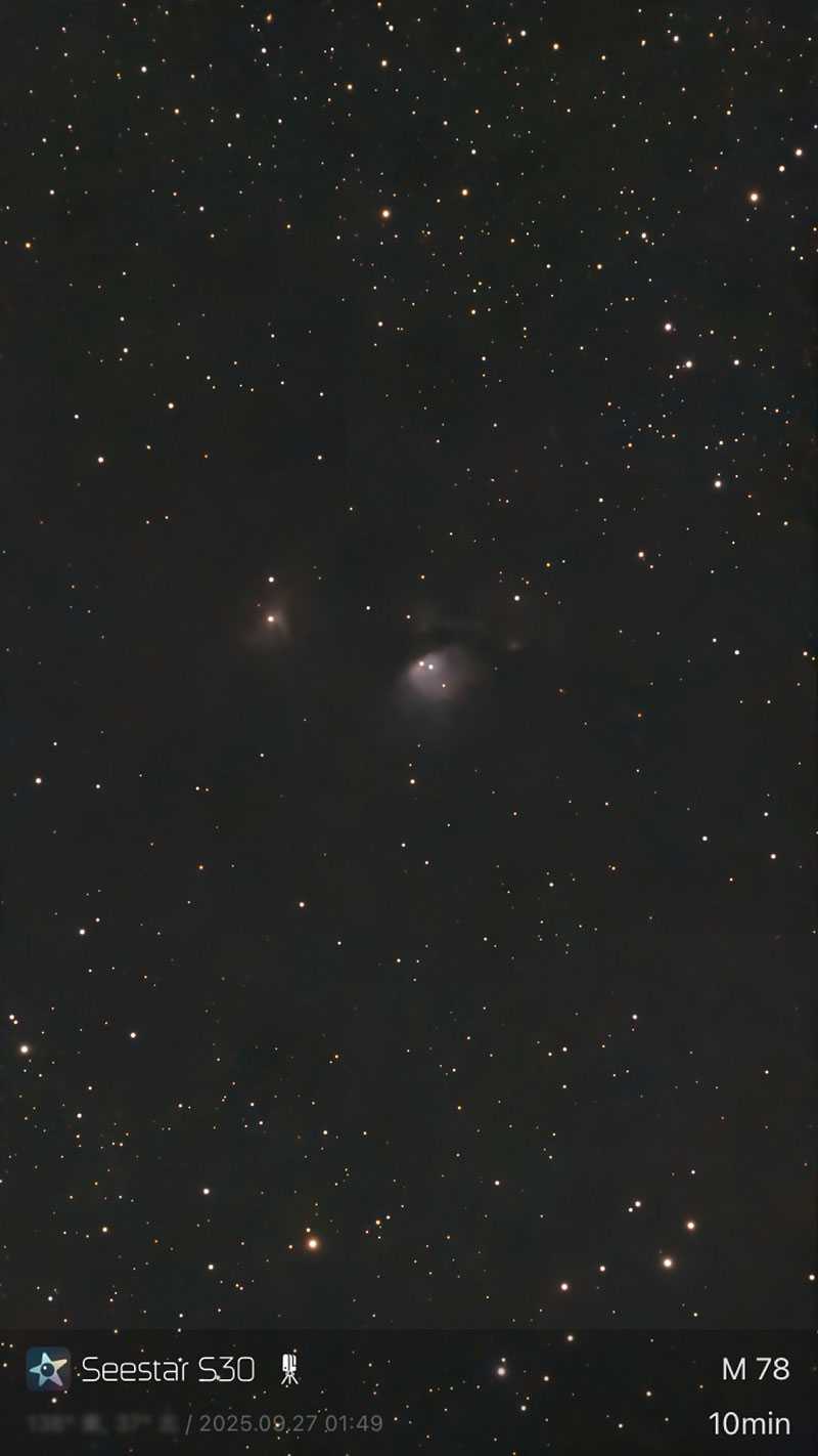 M42はこの写真では右側にも羽衣のような星雲が続いているのですが、やはりS30の自動導入はその星雲の中心部を真ん中に持ってくるようですので、日を改めて位置を補正して写し直したいところです。