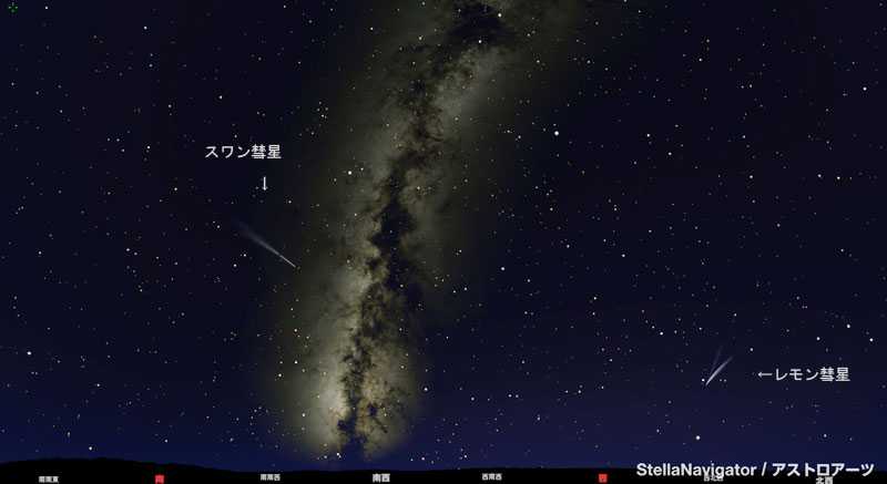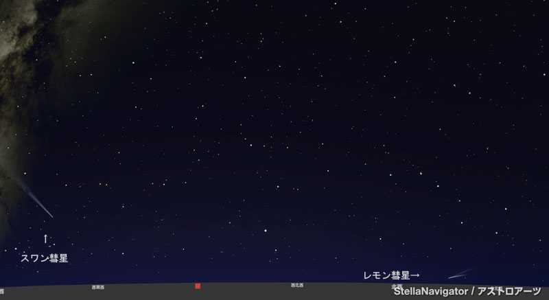 ステラナビゲーターの予測によるとこの時の明るさはスワン彗星は5.9等でレモン彗星は3.7等と出ています。
