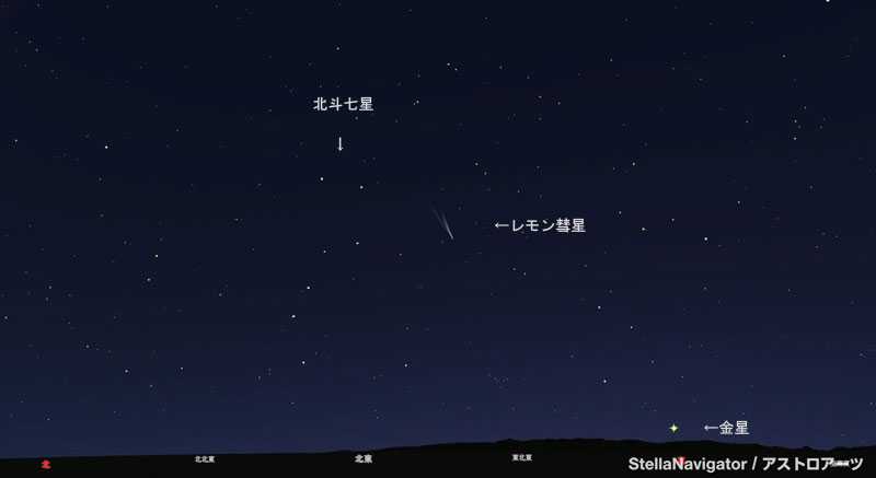 ↑また、同時に北西の空にレモン彗星も出ているようですが、こちらは高度も低く事実上観測は難しいと思われます。