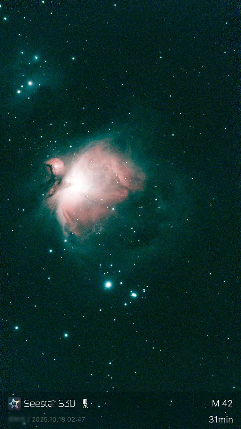 おそらく物干し場からオリオン星雲の方向にちょうどLEDの街灯があり、それによって色合いがズレたのではと思われます。