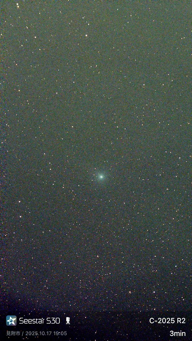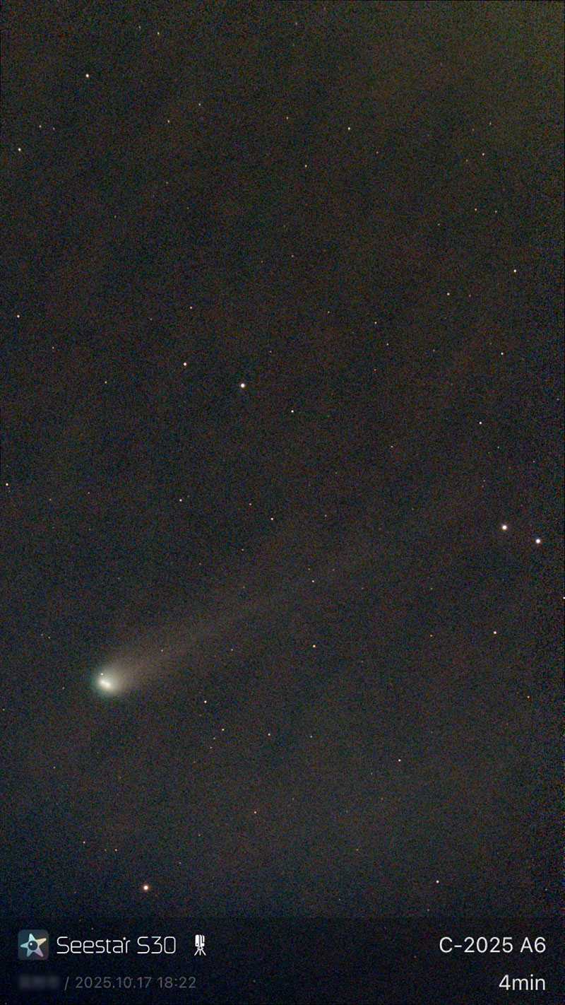 そんなところに先日奇跡的な晴れが1日だけあり、この日を逃しては彗星ももう写せなくなるカモ…ということで、夕方に時間を作って屋根よりスマート望遠鏡で彗星を写してみました。