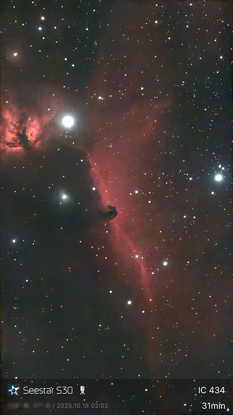 ↑オリオン星雲の撮影を終えた後で、ベッドに寝転びながらスマホを操作して写し始めたオリオン座にある馬頭星雲という所。