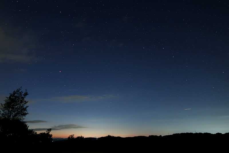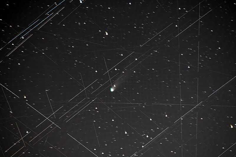 前回のブログにて300mmでレモン彗星を写していましたが、その写真を重ねてみたら凄いことになりました。↑それはこれ。こんな写真なんて作っても面白くないのでザックリと写真を重ねただけですが、真ん中にレモン彗星が写っていてその周りに写っている線は全て人工衛星になります。写真は休み休み写したり1秒の間隔を置いて連写していたものもありますが、時間的には18時35分から18時50分まで、80枚写していたものになります。その中に人工衛星が1つも写っていないカットは11枚で、一番多いカットには1枚で5機人工衛星が写っていました(各露出時間6秒)。_ _ _ _ _←こんな感じで写っているものは1機の同じ人工衛星ですが、それを1つと数えてもこの中で20機くらい飛んでいるようです。↑この写真がどのくらいの範囲を写していたかと言うと、↑この画像の月を囲んだ四角の範囲を写していました。さすがに空全体をこの密度で飛んでいる訳ではなくて一部を切り取れば…という注釈は入りますが、場所によってはこれだけの人工衛星が飛んでいるのが現状になります。人工衛星はこれまでも天体写真を写していれば当たり前のように写っていたものですが、でもこんなふうに写るようになったのもここ1~2年の話になります。これは天文界でも問題になっていて、最近打ち上げられている人工衛星には光を反射しないような塗装がされているようですが、でもこの現状が大きな問題になるまでの近年に大量に打ち上げられていた人工衛星にはその塗装がされていないので、こんな写りになっているものと思われます。昔は人工衛星が写っている写真は省いていたこともありますが、近年になると人工衛星が写ることは当たり前になってきたので省くことはやめていたものの、ここまでくればもう笑うしかないですね(-_-;)。