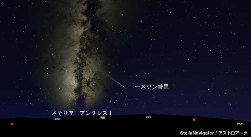 月初の10月の天体情報にもチラっと書かせて頂いておりましたが、現在2つの彗星がやってきていますのて、追加で調べてみました。↑明日の10月11日に観測される場合で天体シミュレーションソフトのステラナビゲーターにて描いてみた図ですが、11日の夕方の薄明(太陽の明かりの影響が夜空に及ばなくなる時間)が終わる時間の18時40分に見た場合、南西の空低く出ているさそり座の1等星のアンタレスの右上辺りに5.9等として飛んでいるようです。5.9等と言っても、彗星の明るさは一番明るい先端部(コマ)や長く伸びた尾の明るさも1点に集まった場合で計測しますので(多分)、実際には5.9等の星よりも暗く見れます。例えば100個の豆電球が100コ集まって光っていると明るいですが、100コをバラバラにまき散らすと暗くなる…みたいな感じでしょうか。管理人はまだ実物を見ていないので何とも言えませんが、5.9等であれば空の暗い所で双眼鏡を使えば、尾は判らないとしても先端部は小さくケサランパサラン^^;や耳かきのボンボンのようにボワっと見れるのではと思われます。↑また、同時に北西の空にレモン彗星も出ているようですが、こちらは高度も低く事実上観測は難しいと思われます。↑そのレモン彗星ですが、11日の日の出前であれば北斗七星の右付近に5.4等として見れそうです。これは薄明が始まる時間の4時22分の図ですのでこれより朝焼けの明かりの中に彗星も消えてゆきますが、レモン彗星は1時ころから地平線を昇ってきて日の出までに高度も上げてゆきますので、3時前後辺りなら観測もし易いのではと思います。↑尚、10月22日の18時26分(当日の薄明が終わる時間)には、2つの彗星を同時に見ることが出来そうです。ステラナビゲーターの予測によるとこの時の明るさはスワン彗星は5.9等でレモン彗星は3.7等と出ています。右のレモン彗星はこの後日が進むごとにさらに明るくなりますが高度が低くなります。また、左のスワン彗星は高度は高くなるものの光度(ややこしい(-_-;))は暗くなってゆくようですので、2つの彗星の明るさと高度のバランスを考えると22日前後は観測に適した日ではと思われます。この情報は管理人がチャチャっと調べたもので間違いがあるカモ知れないので(^^ゞ、正確な情報が必要な方は検索にて再確認して頂きたいところですが、とりあえずご参考にして頂ければと思います。