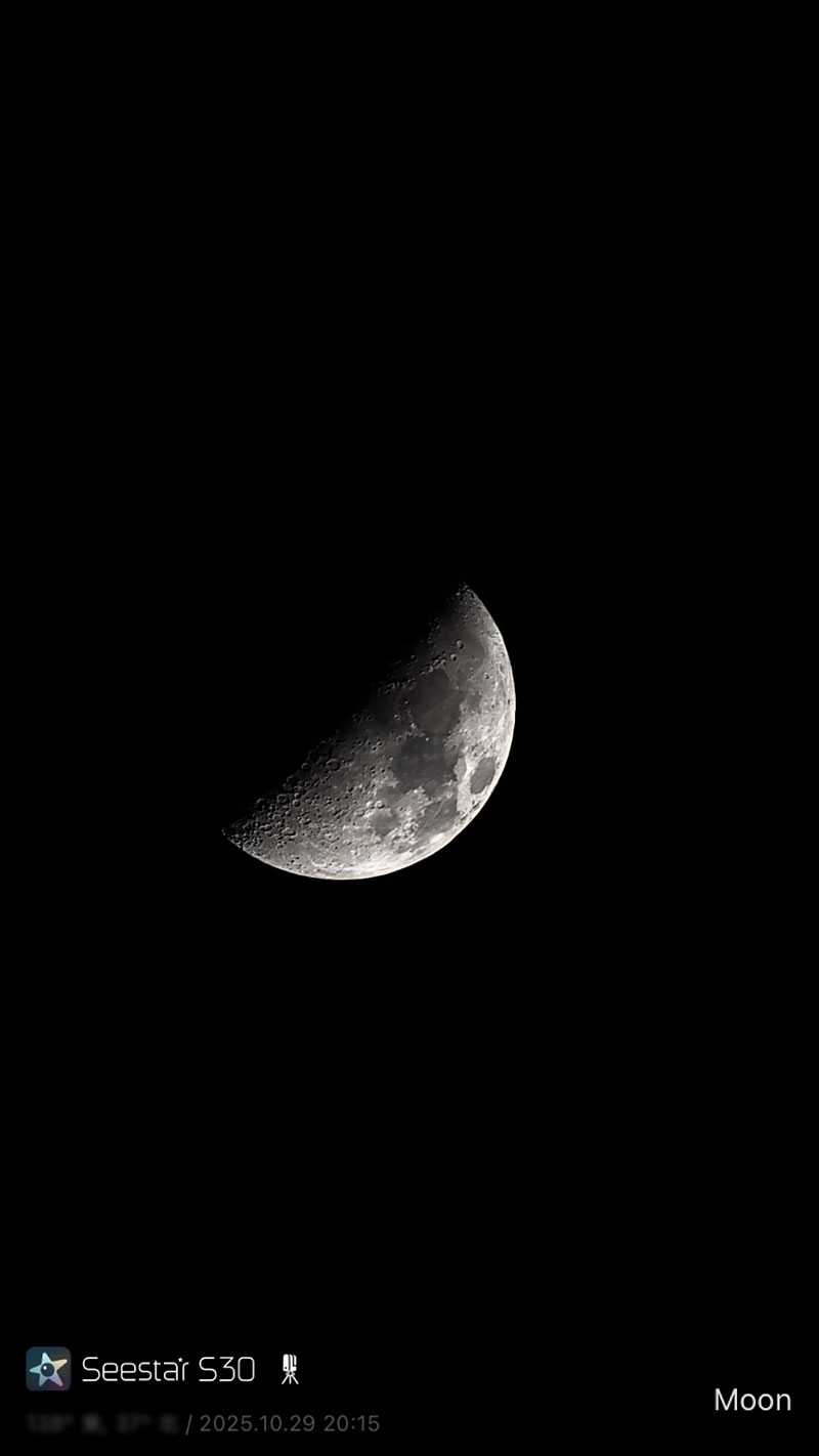夜中に目が覚めました。ついでにトイレに行って窓の外を見てみると、夕方までは雨が降っていたところにどうやら晴れている模様♪。ではということで物干し場天文台にスマート望遠鏡を置いて、ベッドに寝ながら撮影をしてみました。↑まずは冬の星空では大定番のオリオン大星雲。空には半月が出ていましたが、月明かりの中でもS30はこれくらいには写してくれます(アプリの自動補正使用)。本来は20~30分露出したかったところに、アプリの自動画像補正のお陰で判り辛くなっていますが実は写真の下部には電線が写っていて、それも星雲に被りそうでしたので4分で撮影をやめたものになります。↑アプリには彗星のページもあり、見てみるとC-2025K1アトラスという彗星が空に昇っていたようですので、写せるかどうか試してみたらモノノミゴトに写してくれました、それも尾が伸びている姿で。管理人はこの彗星の存在は知らず、朝になって調べてみたら現在しし座の近くを飛んでいる模様。これまでは先日まで夜空を賑わせていたレモン彗星などの肉眼彗星(双眼鏡などを使うとその存在が判る彗星)のような明るい彗星なら撮影に挑戦していましたが、実は彗星とは望遠鏡を使ってやっとボヤっと写せるくらいの物であれば大体いつでも3~4個は空を飛んでいるもので(多分)、でもそれらは総じて暗いし一体どこを飛んでいるのか探すのも面倒くさいのでこれまでは写そうとも思っていませんでした。そんなところにS30を使えばいとも簡単に彗星も写してくれるので、これからは見えるか見えないかくらいの暗い彗星も写してみるのも面白そうです。彗星を写したら雲も出てきたようなので、まだ雲が届いていなかった月を写してみました。↑まずはS30による月の1枚撮り。S30を買った当初は月を写すと画像処理が強すぎたようで月面の描写に違和感を感じていたのですが、それも先日のアップデートにより修正されたようで、今では1枚撮りでも月をきれいに写してくれるようになりました。↑これは月を動画で30秒写して、それをアプリにてスタック(動画の1コマ1コマを1枚の写真として重ねる処理)してみたもの。こちらはスタック処理終了時に自動画像補正が掛かっていたようですが、今更に調べてみるとスタック後の補正は手動でも出来るようで、そのシャープネスを-1弱くすると(自動では5で処理)、自然っぽく仕上がるようです。これまではスタック処理をすれば月面も滑らかに表現できていたのですが、スタックは10秒の動画でも処理に2~3分は掛かり手間だったところに、アプリのアップデートでスタックしなくても1枚撮りでもきれいに写せるようになったところはありがたい改善です。この後にまた雲が取れましたのでとある星雲を写していたのですが、寝落ちしてしまい気が付いたら空も明るくなっていて写真がパァになっていました。ベッドに寝転んでスマート望遠鏡を操作する時は寝ないように注意が必要です(-.-)。
