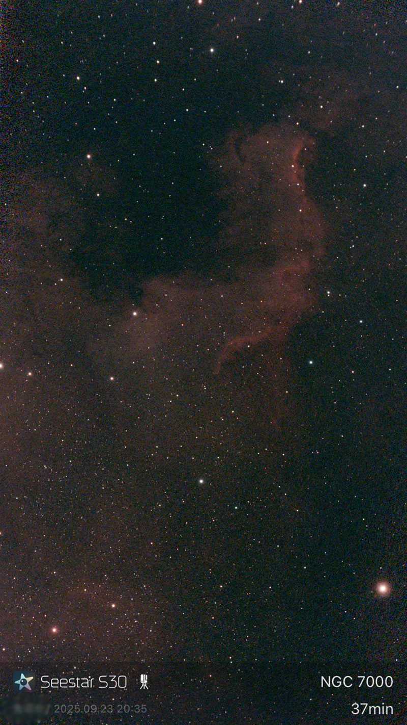 スマート望遠鏡のS30のFramingという機能でモザイク撮影をしてみました。ここで言うモザイク撮影とは、撮影対象を中心として少しずつ、その周りも写していってそれらを合成して、結果として1枚の広く写した写真として仕上げる撮影方。S30が発売された当初は付いていなかった機能で、後日アップデートにより使えるようになったようです、多分。↑例えばS30で北アメリカ星雲というものを写すとこのように写せるのですが…↓↑北アメリカ星雲の近くにはその形からペリカン星雲と呼ばれている星雲もあって、できればその2つを一緒に写したいところです(300mm相当で撮影)。↑そこでFraming機能を使って画角を2倍(設定できる最大)にして写してみたものがこれ。ちょうど北アメリカ星雲とペリカン星雲を一緒に写すことができました。ただしFraming機能を使うと中央から少しずつ周りを写して行くので、この写真でも20~30枚写して1枚に仕上げていると思われます。なのでこの1枚を写すのに1時間かかっております。…と、広く写せる事は判ったのでこれでまたS30の可能性が広がったことは良かったのですが、でも、どうも北アメリカ星雲の写りがおかしい(・・?。世界地図の北アメリカ大陸に似ているはずの星雲の形がパズルの作りかけのような写りになっています。実はこれは最近気になっていて、先日にあったアプリのアップデートをしてから天体によってはこんな写りになるような気がしていました。↑例えばこれは10月(アップデート前)に写していた馬頭星雲付近ですが…↓※Framing機能は使っていません。↑アップデート後に写したものがこちら。日時も空の状態も違いますので同列で比べられないところはありますが、10月に写していた馬頭星雲に比べてアップデート後に写していたこちらの写真では、星雲がくっきりと写っていますが、でも上の写真では淡く写っている赤い星雲がこちらの写真では良く写っていなくて黒く抜けている(コントラストが強い?)ように感じます。これは撮影時の条件による一過性のものなのかひょっとしてアップデートで画像処理の部分にも手が入っていたのか、はたまた管理人の個体の理由なのかわかりませんが、しばらく様子を見ようと思います。