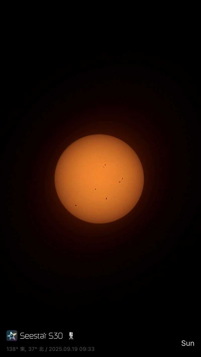 昨日の昼休みに駐車場にてSeestarS30を使って太陽を写してみました。↑黒点の並びがちょうどすばる星団のようになっていました。↑これがすばる(M45プレアデス星団)ね。黒点の並び方なんて全くの偶然でしかありませんがそれが他の天体と似ているところを写せたことは、これから天体の説明をする時のネタとして使えそうです♪^^;。スマート望遠鏡のS30の動きですが、いつものように地面に置いて太陽を導入させるとザックリ太陽の方にレンズは向きましたが(太陽フィルターの装着は忘れないようにっ)、「太陽が見つかりませんでした」みたいな表示が出ていました。GPSである程度の緯度経度とそこから導き出したその時間の太陽の高度などを計算してその方向へレンズを向けているものと思われますが(多分)、いくら太陽は見た目でも大きいとはいえ(裸視では太陽は絶対に見てはいけません)広い空の中からその1点にレンズを向けることは難しいのでしょうね。でも太陽の方向へ向くだけでもすげぇ制御だと思います。その後アプリの手動操作で太陽を導入させるのですが、ザックリ画面に導入した後は対象を真ん中に持ってくるボタンをタップすると自動で太陽を真ん中に持ってきてくれます。望遠鏡を使って手動で太陽を導入する面倒くささを知っている者からすれば、使えば使うほどS30の操作は楽でありがたいです。太陽が画面に入ってからはリアルタイムの像が見れるのですが、見ていたら太陽の表面を頻繁に"何か"が通り過ぎているところが見れました。管理人はこれまでも望遠鏡に太陽用のフィルターを着けて太陽を観測したことは何度もありますが、表面を何かが通り過ぎているところを見たことはありませんでした。おそらくスマート望遠鏡の太陽フィルターが画面を通して見ることを前提としているので濃度が薄く作られていて、それでその"何か"が見れたものと思われます。それを動画で写してみましたのでご笑覧いただければと思います。クリック → 太陽の動画 ← クリック1分少々写していた物をザックリ30秒に切り取り、さらに"何か"は結構速く動いていたので25%程遅くしてあります。動画が始まって早速上の方に大きめの黒い物体が2つ通り過ぎます。また、13秒くらいのところで小さいものが1つと、最後の方で真横に1つとあと2つ通り過ぎて行っているようです。これって鳥なのでしょうかね?。見た目の太陽の大きさは手を伸ばして持った5円玉の穴の中に入るくらいの"小ささ"なのですが(再度書きますが肉眼では絶対に太陽は見ないように)、そんな狭い範囲内を短時間に鳥が何羽も飛んで行くという事もすげぇことだと思いますし、6コではありますがそれらが全て左から右へ飛んで行っていることも偶然と言っても不思議に感じます。これらってひょっとして人工衛星ってことはないのでしょうかね?。天体シミュレーションソフトのステラナビゲーターではある程度の人工衛星の軌道も表示させられるのですが、それを使ってみましたが当日の同時間に太陽の真上を通る人工衛星は出てきませんでした。ですが現在ではス夕-りンクとか言う人工衛星が新たに何千機も打ち上げられているようで、まさかそれが通って行ったという事は無いでしょうかね。どちらにしてもこれだけ多くの何かが太陽と地球の間を通っていることを初めて知ったのはS30のお陰ですね。