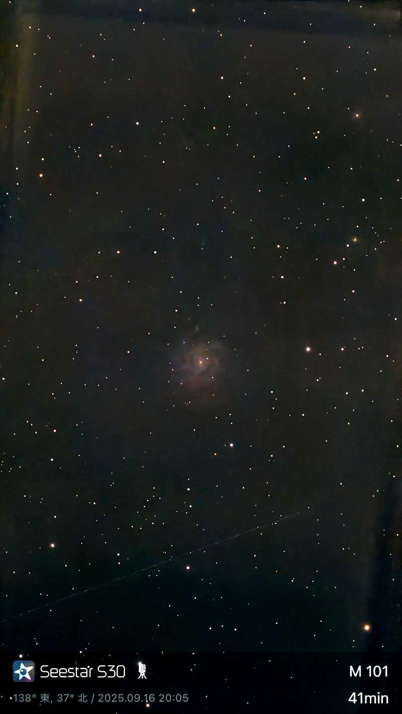 昨日は久しぶりに晴れました。…ひとえに晴れと言ってもご説明させて頂きますが、モノの本によれば新潟は曇っていても雨や雪が降っていなければ「晴れている」と言うと書かれており、それは実際に管理人も仲間に「そっちは晴れている?」と聞かれると、前述のように雨が降っていなければ「晴れているよ」と返事をすることがあります。特に冬の新潟はお日様が出る日が少なく(-.-)、どうやらその為に曇っていても雪が降っていなければ「晴れ」と言うようなんです、多分。新潟ってホントに切ない地域ですね、住めば良い所ですが。今回ここで言う「晴れ」とは星が見れそうな天気のことを差しています。先月にスマート望遠鏡のSeestarS30を買った直後は晴れ(星が見える天気)が続き連日その描写性能を試していましたが、それも9月に入ると雨が降る日が多く、ここまでSeestarを使う機会がありませんでした。そんなところに昨日は昼から青空が♪。久しぶりに屋根から写してみようと暗くなる時間を待ちました。しかし夜が暗くなる時間も早くなりましたね。それこそSeestarが届いた8月の下旬は空が暗くなる薄明という時間が終わるには20時まで待たなくてはなりませんでしたが、昨日は19時20分には薄明も終わる時間になってました。早い時間に空が暗くなればそれだけ早くお星様を写し始められるのでありがたいのですが、でも冬が近づいてきていることも実感するので悲しいところもあります。季節の移り変わりだけは必ずやってきますね。ではと、まだ薄明るい19時10分に屋根に上がって準備を始めました(Seestarは前準備に5分~10分程度かかります)。…と、空を見上げていると西の方から雲が(゜o゜)。天気予報では"快晴"ではなかったのである程度の雲は想定していましたが、さっきまで晴れ渡っていた空が所々に雲の切れ間があるくらいまで曇ってきました。でも久しぶりに屋根に上がりましたし、今回も1つ試してみたいことがあったのでしばらく待っていると、少しずつですが切れ間も広がってきました。↑切れ間の中に何か天体は無いかな…と、まずは北斗七星の近くにあるM101という銀河星雲を写してみました。北斗七星も現在夕方には北西の空に低くなっていて、その為に写真の右下には電柱も写ってしまいましたが何とか写すことが出来ました。※今回の写真には全てアプリの自動補正+管理人流の画像補正を"どぎつく"ならない程度に施してあります。今回試してみたかったことは、見晴らしのいい屋根にS30を放置してきて部屋からリモートで撮影出来ないかな…ということ。部屋の隣の物干し場からなら写せることは判りましたが、でも物干し場からでは見れる範囲も狭いのでやっぱり屋根から写したいところ。そこでS30を屋根に置いてタブレットを持ってはしごを下りて、窓をくぐって家の中に入ると壁を1つ通ったところでS30とタブレットの通信が切れました。障害物が無ければ20mくらい離れていてもリモート操作が出来るようですが、Wi-Fiの電波はやっぱり壁には弱いようです。まずは屋根にS30を置いて部屋の椅子に座ってリモート操作をするという究極のながら撮影の目論見は音を立てて崩れてしまいましたが、屋根から下ってきた窓の中からではリモート操作が出来たので、冬に屋根に雪が積もっていなければ(-_-;)これまでは写してこれなかった真冬の星々(とてもじゃないが冬に山の中までなんて行ってられませんっ)も写せる公算が出てきました♪。ちなみに上の写真は窓際にタブレットを置いて部屋に戻り、夕ご飯を食べてきてまた屋根に向かった時間が40分後でしたので都合40分露出してあります。↑ご飯を食べてきた後もまだ雲は出ていましたが、星団なら星雲よりは雲の影響も少ないのではくちょう座にあるM39というものを写してみました。望遠鏡で見ると明るめの星がまばらに広がっていてきれいに見ることが出来ます。↑雲の切れ間と雲が流れて来る方向を読んで、10分程度は写せそうだったのではくちょう座にある北アメリカ星雲(NGC7000)というものを写してみました。星雲の形がメキシコ湾付近の北アメリカに似ているのでこの名前が付いていますが、S30の自動導入でレンズを向けると星雲の中心(この写真では左上)付近を中央に持ってきて写すようで、それでは特徴的なメキシコ湾の形が写せないのでアプリで位置をズラして写しています。これも撮影を始めた後で1度部屋に戻って20分後くらい(←適当)に屋根に向ったら16分の撮影となっていました。空を見るとまた雲が広がっていて北アメリカ星雲の所にも雲がかかっていたので、10秒で写した写真を重ねてくれるアプリが雲で良く写せなかったカットは自動で削除してくれるようです。↑雲の切れ間にあるNGC457という星団を写してみました。↑トリミングして線を書き込んでみましたが、この星団は宇宙人がバンザイをしているように見れるので、通称宇宙人星団とかトンボ星団とか、ふくろう星団とか呼ばれていて天体観測会の時に子供に