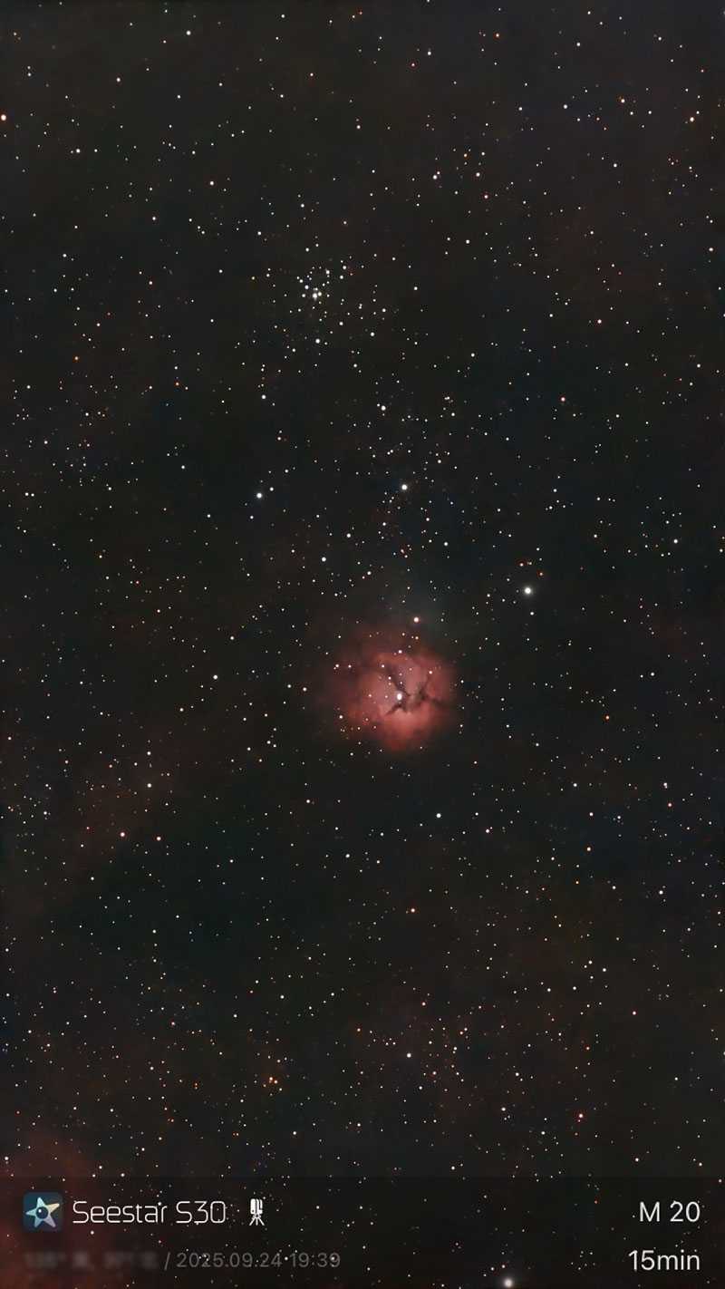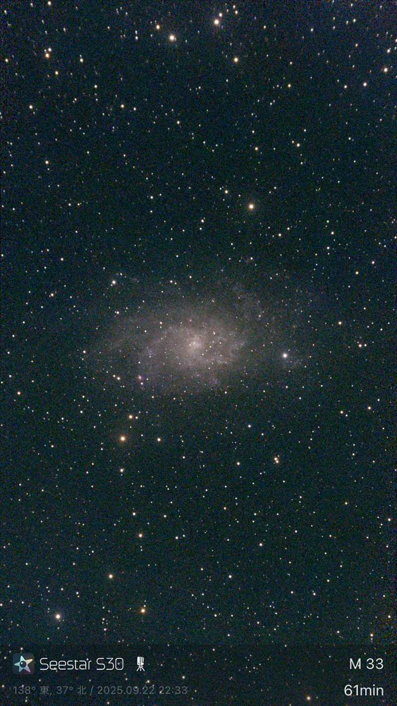 最近は星が見えるとスマート望遠鏡のS30での撮影を楽しんでいます。正直なところ管理人は普通の望遠鏡も持っているのでS30をどこまで使うか疑問もあったのですが、フタを開けてみれば現在良いオトナのオモチャになっています♪、せっかくきれいに晴れていても山奥まで行って写真を撮らなくなっているという悩みもありますが(-.-)。そんなところに前から気になっていたSeestarアプリに付いている「プラン」というものを使ってみました。管理人は取扱説明書を読むのも面倒くさいのでmonoは使いながら操作法を覚えてゆくところがあり(-_-;ゞ、今回も屋根にて行き当たりばったりで試してみましたが何とか使うことが出来たようです。プランとはSeestarアプリに前もって撮影する順番を設定できるもの。設定できる時間は時計と同期しているようで、10分単位で〇〇時から〇〇時〇〇分まで天体Aを写して、〇〇時〇分になったら天体Bを〇〇時〇〇分まで写して…と、全自動で写してくれるものらしい。先日も屋根からS30で星を写してみましたが、その時は屋根にて1つの天体を写し始めたら一旦部屋に戻り、時間がきたら屋根に上がって別の天体を写し始めてまた部屋に戻り…と、屋根と部屋とを何度も行き来していたのですが、このプランを使えばS30とタブレットを屋根に放置して下りてくれば、複数の天体を自動で写してくれるという事になります。今回は3等星がギリギリ見れるくらいの街明かり(←"町"ではなくて)のある住宅街の屋根にて試してみました。まずは夜の7時に屋根に上がってS30とアプリを繋いでからプランの準備を始めました。プランを作るにも時間が掛かるだろうからと1つ目の天体は7時10分から7時30分まで撮影するようにセット。続いて次の天体を7時30分から7時50分まで撮影するようにして…と、今回は4つの天体を20分ずつ写すようにプランを作ってみました。設定が終わって時計を見ると7時6分。プラン撮影の開始スイッチをタップしてもS30が動く様子はありませんでした(・・?。S30は電源を入れてから1つ目の天体を写そうとすると、1.その天体を導入する2.本体が水平に置かれているか確認する3.空の明るさを確認してそれに合わせて写せるように調整する(多分)4.フォーカスを合わせる※足りない項目があったらゴメンナサイとの手順を踏むはずで、それには5分くらい掛かるはず。プランを作れば撮影時間に合わせて前準備もしてくれるのかな…と思っていましたがそうではないようで(多分)、不安になって一旦プラン撮影は停めて最初の初期設定をアプリを操作して済ませました。そして全体的に撮影時間を10分ずらして改めてプラン撮影を始めると、最初の撮影開始時間の7時20分になるとS30がその天体に向って動き出しました。そしてレンズがその天体の方向へ動いていること確認したところで、一旦部屋に下がりした。結果としてプラン撮影は4つの天体を2セットで計8つ試してみましたが、ちゃんと8枚撮影が出来ていました。これなら雨が降らないことが担保できれば、屋根にS30を放置してきて秋の夜長にご飯を食べて風呂に入っている間に5~6枚は写してくれるので、天体写真のコレクションが増えそうです♪。以下の写真はプランに任せて写した中の一部を載せてみますが、例えば8時に撮影を始めて8時20分まで写し、8時20分から次の天体を各20分ずつ写すように設定しましたが、露出時間が15分とか12分とか表示されています。S30の隣で動作を見ていた訳ではありませんのでなんとも言えませんが、プランの設定どおり8時20分に1枚目の撮影を終えて、次の天体は同8時20分から撮影させるように設定していて、でもそこに次の天体を自動で導入する時間がかかる訳ですので差異が出ているものと思われます。でも10何分で写して補正をしたとしてもこれだけ写せるのでやっぱりS30は凄いですね。↑南の空に低くてさらに20万人都市の街明かりが届いている空の中で写したいて座の三裂星雲。※今回の写真の4枚ともアプリの自動補正を掛けています。↑雲が迫っていたので雲の切れ間に赤い星雲は無いかな…と、アプリに表示される星雲の写真の中から選んでいたカシオペア座とケフェウス座の間にあるNGC7635というもの。アプリの星図にてすぐ隣にM52という散開星団があると出ていたので、その両方が写せるように位置を修正して写しています(2つとも管理人としては初撮影)。↑S30ではもう何回も写していますが、ちょうど雲もやって来なそうなところに出ていたのでアンドロメダ銀河もプランの中で写してみました。設定を間違って30分で写すようになっていたので、21分で手動で撮影を停めていますが、これまでS30で写してきた中で一番立派に写ってくれました。↑すばるもプランの中で撮影してみましたが、雲がかかってきて撮影が進まなくなったので2分で撮影をやめました。2分露出では自動補正を使ってもザラザラしたノイズが取り切れないようです。プランを使った感想ですが、現在はアプリの時計と紐
