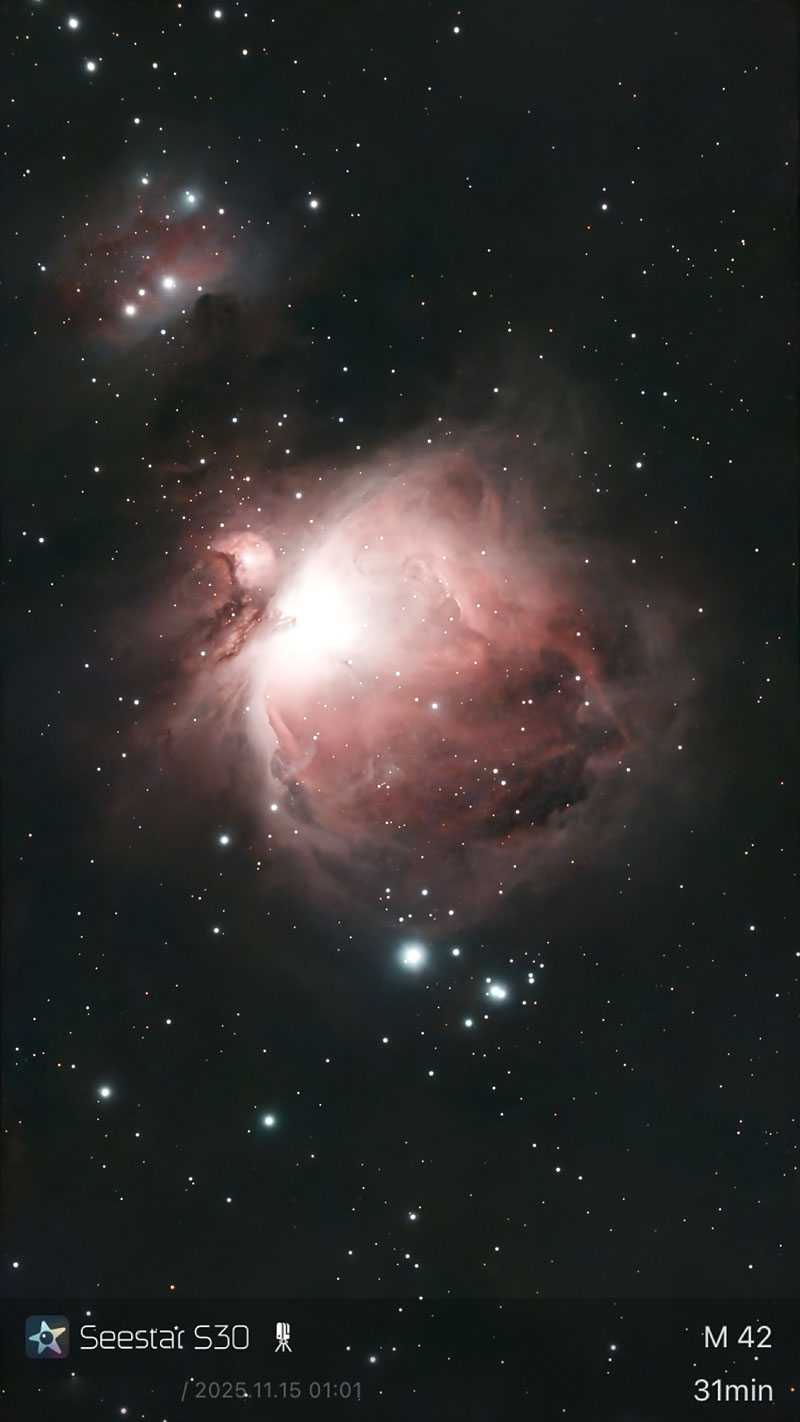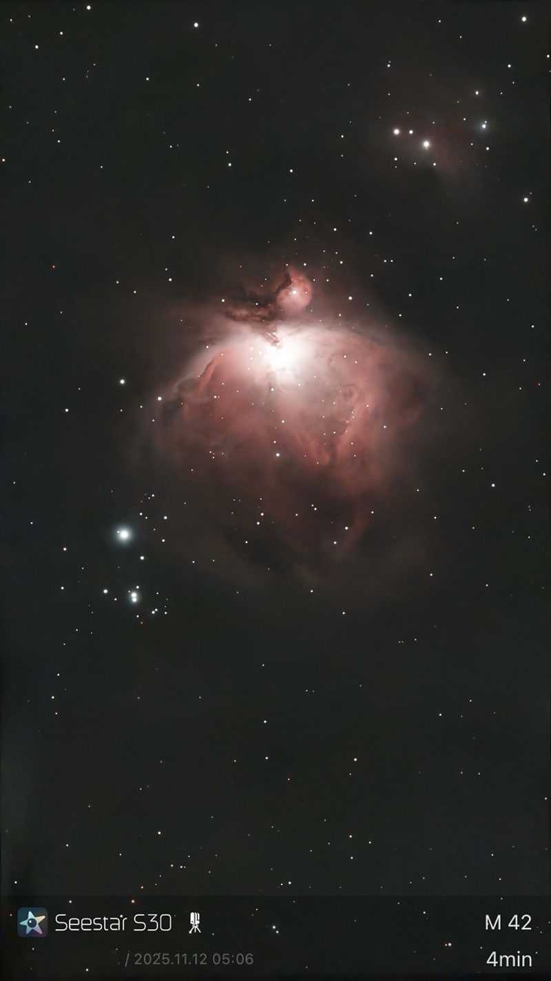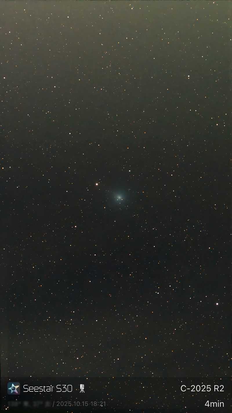 昨日(今朝?)も夜中に起きました。いつものようにトイレ(-_-;ゞの窓から外を見ると星が輝いていました。どうもスマート望遠鏡を買ってから星が出ていると、その晴れ間がもったいなく感じてしまうようになっています。なので今回"も"夜中に物干し場天文台にS30を設置しました。この時期はレンズが夜露ですぐ曇るので、その曇り止めの為にS30に内蔵されているレンズヒーターをonにして、その電力分としてモバイルバッテリーとS30を繋いで物干し場に放置して、再びベッドに入りました。まずの最初の被写体としてオリオン大星雲を導入してみましたが、いつものように自動でレンズがオリオン星雲の方向に向って(寝転がっているのでその動作は見ていません)、まずは試写をして星雲がレンズの中に入っているかを確認しているようで(多分)、今回は最初に停止したところから少し修正して星雲が真ん中に入ったことがタブレットの画面に出てきました。多分アプリの星図と紐づけされていて、その星図の星の並びと実際の空の星の並びとを比べて星雲の位置を認識しているものと思いますが、何度S30を使ってもこの導入の制御には感心してしまいます。そしてこれもいつものようにS30が水平に設置されているか自動で検出するのですが、いつもであれば40%→60%→80%→90%…と進捗状況を表示するところに一向に40%から進まない(・・?。そして英文で「水平を出せませんでした」(注:多分こう書かれているものと思われる)と出てきました。実は初期設定でS30が水平を出す時は、本体に電源コードを着けていると結構な頻度で水平出しを失敗するんです。ひょっとすると水平出しはえらい微妙な精度で検出していて、コードが付いていることに因るわずかな引っ掛かりでもエラーを起こすのカモ知れません。なので今一度ベッドから下りてタブレットを持って外に出て(寒いっ(一一"))、電源コードを抜いた後にまた最初からS30の設定を始めたら、今度はモノノミゴトに設定が進みました。最近はスマート望遠鏡というキーワードで当ブログへお越しになられている方もいらっしゃるようですので、その方への参考になればと思います。無事設定が終わってまたベッドに戻り、撮影を始めました。↑そして写したものがこれ。S30では自動でオリオン星雲を導入すると、一番明るく写っている部分を中心にして撮影を始めるので、手動で明るいところを左上に少しずらして星雲全体が写るように修正しています。右下に撮影時間が31分と出ていますが、最初の3分くらいは徐々にモニターの画面に浮かび上がってくる星雲を見ていたものの気が付いたら15分まで進んでいて、ではキリのいい20分で撮影は止めて次を写そう…と思っていたら次に気付いた時には28分で、2回寝落ちをしていたようでした。なので20分写す予定が30分になったという次第です。尚、ノイズ除去などの画像処理をしていますが、これもお越しいただいた方の参考になるように付属アプリの中で出来る範囲の処理をしています(以下同じ)。↑続いてオリオン座の中にある馬頭星雲というものを写してみました。オリオン星雲もこの馬頭星雲もS30でもう何度も写していますが、今日の写りは…という事で何度写しても面白いものです。尚、1時間写していたようですが、当然寝落ちしていました(^^ゞ(これも撮影位置を修正しています)。他にもあの星雲を写してみたいというものはあったのですが、物干し場からでは見える空の範囲も狭く、今回は写せる範囲の中で他の面白そうな天体は思いつきませんでした。そんなところにS30の操作アプリには彗星のページがあり、それを使って先日に尾も写せていたC-2025K1に向けてみるも物干し場からでは写せない模様。ではもう一つ出ていた24Pというものに向けけてみました。↑そして写していたものがコレ。アレっ?、彗星は(・・?。先日来ていたスワン彗星は、肉眼ではわからなくてもS30では結構写ってくれましたが、この24Pというものはモニターを見ていても1分経っても3分経っても彗星らしい姿が浮かび上がって来る様子はありませんでした。そのまま写していてこれも寝落ちして、気が付いたら65分経っていたものが上↑の写真です。↑これまでの経験からS30が彗星の位置を間違うことは考えにくいですので、上の写真のど真ん中を切り取って大きくして強めの画像処理(パソコンのソフト使用)をしてみたら、何となく彗星状の物が写っていたようでした。彗星は周りの星とは別の動きをしていますので流れて(移動して)写っているようですが、ちゃんと彗星らしきものを写していてやっぱりS30はすげぇですね。でも1時間露出していてやっとこの明るさでは一体何等級だったのかな。S30が無ければとても写してみようとは思わない天体です。この画像を確認したらまた寝落ちしたようで、次に気が付いた時には空が白くなっていました。でも寝落ちしていなかったら寝不足になっていたところですし寝ながらの撮影は大変楽ですので^^;、この