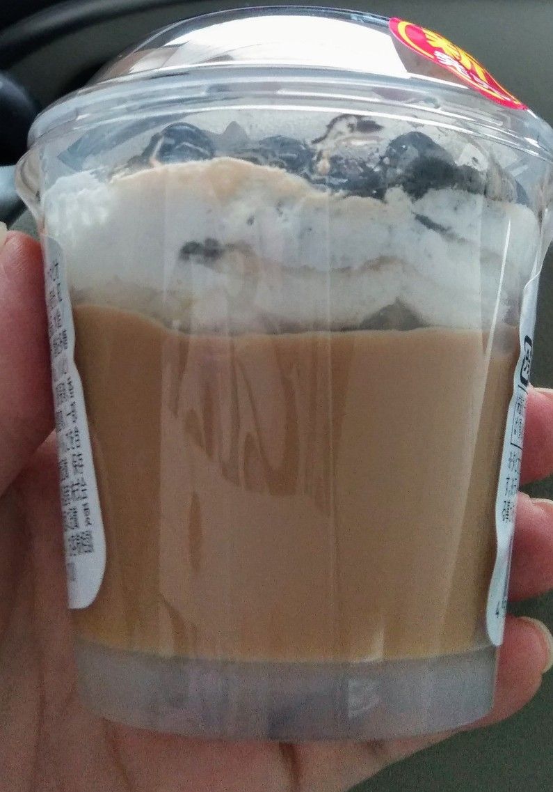 ミルクティープリンの上に紅茶ゼリーとタピオカ。