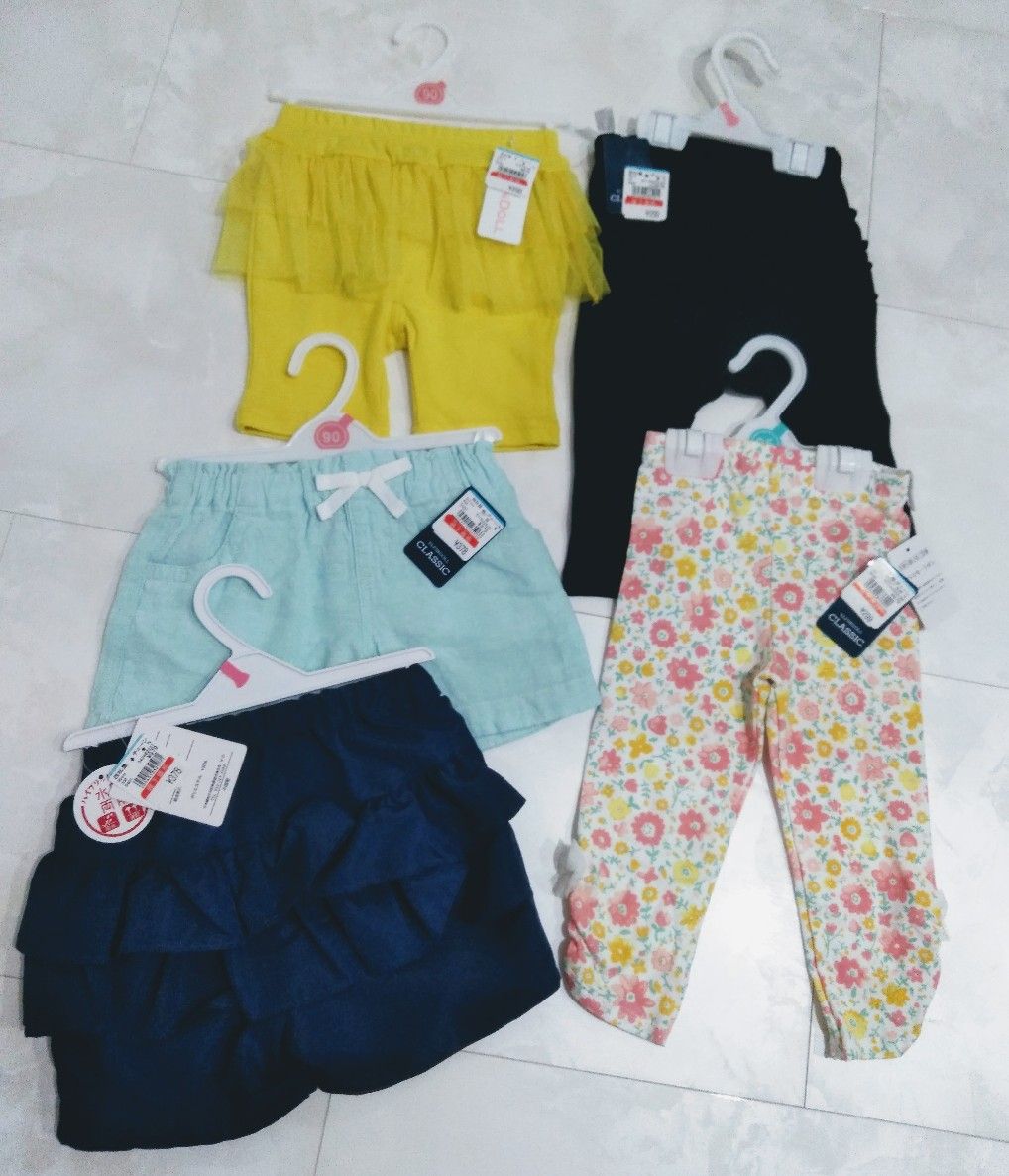 黄フリルパンツ、黒バックフリルパンツ、花柄パンツ 148円。