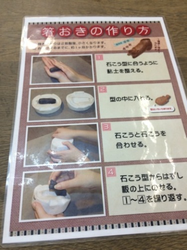 ホテルマイラから皆さん、こんにちはヽ|・ω・|ゞ前項の続きとなります。念願の備前焼体験で、箸置きを作ることにしました。【がいちゃんσ(゚∀゚*)me♪】です。作り方の工程を写真付きで、分かりやすくシートにしてくださっています。はじめに作り方を備前焼工房のスタッフの方が優しく丁寧に教えてくださいます。箸置きの形は数種類ある中で、フグにしました(^^)こちらの石膏に粘土を入れて挟みます!お団子状の粘土をフグの型に合うよう形にして、ヒレや背ビレを少し伸ばして下の型に乗せます。そして、上の型をぴったり合わせて上からぐぅーーっ!と力を入れて押します!石膏の型を片方、外すとフグのお腹が見えました。この状態で型をパン!パン!パン!パン!と叩いて型に密着している粘土を外します。少し外れたかな~というところで、粘土をかるく指で押さえて外します。これが、なかなか外れなくて苦戦!隣ではナオさんが葉皿制作に夢中。はずれました(;^ω^)フゥ余分な部分をヘラで落とし、水で濡らした鹿の皮で撫でると出来上がり!鹿の皮はコチラ。鹿の皮と聞くまで、二人とも昆布かと思っていました。箸置きは5個制作するのでこの工程を×5回繰り返します!4個くらいで心が折れそうになりましたが、ナオさんが見本のフグが囲まれていく姿を見て喜んでくれたのでやる気が復活しました!(^^)!最後にフグのお腹にサインを入れて完成!!焼き上がりまでに1ヶ月ほどかかるとのことです。手元に来るのが楽しみです(^^♪************************************************************岡山城天守閣内「備前焼工房」体験料金:1,230円(粘土500g)※岡山城入場料別途所要時間:約60分体験開始時間:10:00~、11:00~、13:00~、14:00~、15:00~※予約優先完成作品を配送する場合は送料が必要になります。住所:岡山市北区丸の内2-3-1 岡山城天守閣内お問合せ:086-224-3396営業時間:9:00~17:30 (入館は17:00まで)アクセス:岡山駅から路面電車「城下」下車徒歩10分************************************************************岡山城まで徒歩約15分!近隣のグルメも充実してます!(^^)!