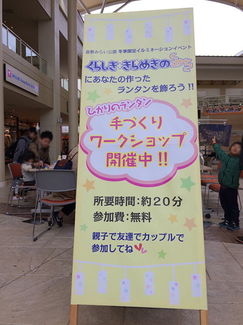 こんにちは!今年もあと1ヶ月を切りましたね。12月はXmasに忘年会、年末の大掃除に新年を迎える準備などと、慌ただしく過ぎていきますね。その中でも12月だから楽しめるのは、やっぱり街のイルミネーション(^^♪あちらこちらでキラキラ輝く光を見ると、神秘的な気分になれますね。そんなキラキラに参加したい!っと、先日ランタン作りのワークショップに行ってきましたよ♪「くらしき きらめきのみち」イルミネーション☆彡倉敷の明るい未来をイメージしたイルミネーション!3年目の今年は、倉敷みらい公園~JR倉敷駅北ペデストリアンデッキまで範囲を拡大し、イルミネーションLEDも約15万球にパワーアップ(^^)/コチラは昨年の写真をお借りしました。そこへ飾られるのが、倉敷のお土産にも人気のマスキングテープ「mt」を使った手作りランタン♪この日は三井アウトレットパーク倉敷で行われていました。ランタンの型紙に好きな絵を描いたり、マスキングテープを貼ったり(^^♪家族やカップルで思い出つくりができますね。絵が描けたらクルッ巻いて、ホチキスで留めて完成です♪20分くらいでサクッとできますよ~。自分の作ったランタンを探すのも楽しみです(^^♪そして、12月2日(金)から始まるのが、JR倉敷駅北の時計台のあるアンデルセン広場と、倉敷みらい公園内にハート型のイルミネーションが出現します!アンデルセン広場のハート型イルミネーションと同じものが、倉敷みらい公園内に何個あるか探して応募すると、先着100名様に素敵なプレゼントが(^^♪アンデルセン広場ではハートがたくさん出現し、スポットライトでも大きなハートを演出するのでデートスポットにおススメですよ~♪素敵な思い出の写真が撮れそうですね(*^^*)是非お出かけください(^^)/◇◇◇◇◇◇◇◇◇◇◇◇◇◇◇◇◇◇◇◇◇◇◇◇点灯場所:倉敷みらい公園、JR倉敷駅北デッキ点灯期間:2017年2月14日(火)まで点灯時間:17:00~23:00ランタンワークショップ:12月23日(祝)11:00~17:00アリオ倉敷お問合せ086-426-3025倉敷まちづくり推進課◇◇◇◇◇◇◇◇◇◇◇◇◇◇◇◇◇◇◇◇◇◇◇◇イオンモール岡山から直進!徒歩5分! ホテルマイラのおすすめ観光&グルメスポット よかったら応援おねがいしますm(__)m ポチっと↓ にほんブログ村