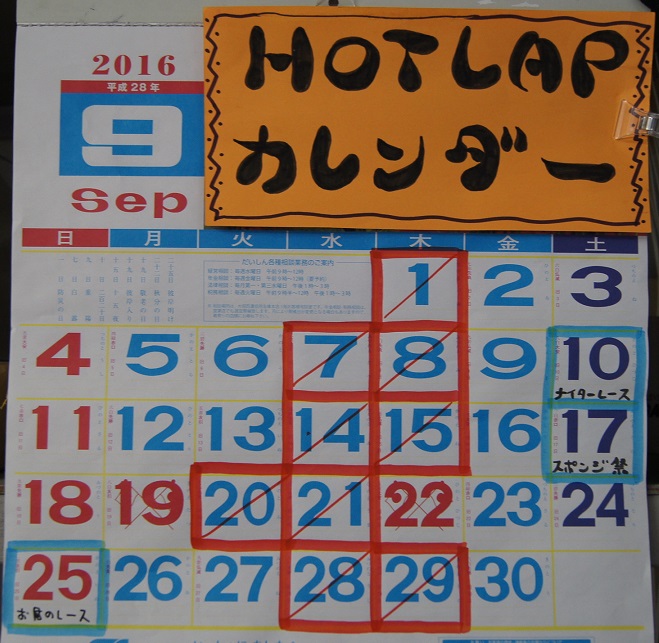 こんにちはー HOTLAPですーー遅くなってすんません9月のカレンダー 見てねまず 10日 土曜日HOTLAPナイターレースがございますーカテゴリーは4つタミチャレZERO 7500rpm1/10DDレース 7500rpm1/12DDレースミニクラス でございますー先月より 1つ減りました ちょっとだけ 時間に余裕ができますね夕方5時からレース時間割 7時スタート 当日エントリーOKOKお気軽にご参加 よろしくお願いいたします17日 土曜日 今回は土曜日の夜に スポンジ祭開催ー1/12モデファイと 1/12ストックのイベントオープンより 1/12レーシングのみの走行会レースは ちょっと(~_~) とゆうかたも 夕方4時までは 1/12なら走行OK6時レーススタート 予選は メイン数次第で 2回~3回のどちらかですすべて 8分間の周回計測です いっぱい走れますねーー(^-^)10時くらい 終了予定ご参加 お気軽によろしくお願いいたします25日 日曜日 HOTLAPお昼のレースがございますーカテゴリーは 5つ 13000rpmツーリング 9000rpmツーリングタミチャレGT タミチャレFF(また自分走らせてね) F1グランプリ6000rpmです 早始まり早終わりの1日ですPITは8時半に入れます コースオープン9時 スタート11時30分夕方4時くらい終了予定ちょっとは 涼しくなってるかな? お気軽にご参加よろしくお願いします(^o^)丿では 9月 よろしくね(^o^)丿