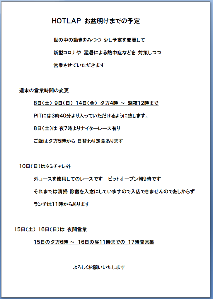 こんばんはー HOTLAPですーやっぱり 一日一日いろいろありますねなかなか ピシっとした予定は 今はたてられないです((+_+))お盆明けまでの予定を だしましたカレンダーの時と変更したところありますので ご確認くださいいろいろかえてすいません 考えて考えて考えましたまず やっぱり 新型コロナと 40℃の気温がヤバいです簡単に熱中症になりますね 休みの日にずっと店にいていろんなことしてみましたが 12 1 2 3時は もうダメっすマスクつけて呼吸できないです 体調悪くなります4時半ころから 少しですが スッと 日差し 気温が楽になりますもう 4時からで お願いします平日は 通常の 11時~22時30分でお願いしますただ 35℃まではカーペット対応してますが それ以上は気温とともにうねります35℃こえると 12レーシングのマシンは ちょっとキビしいと思ってくださいツーリングなどのタイヤ大き目なら 余裕ですが 12は 35℃以下がおすすめです34℃以下になると まっ平になりますカーペット購入時に分かってはいたんですがね(*_*) 明かりとりが 最近の日差しには キツイですねでも ないと いつでも真っ暗になってしまうので 7月 8月がまんですね8日(土) 4時から開店で 7時レーススタート予定カテゴリーは 5つ F1 12GT フレッシュマン ノンブーと 吉山さんとゆかいなトレーラー です 17時から日替わり定食できますあとはいつもと一緒な感じで わからないことあればお気軽にスタッフまで<(_ _)>10日(月) 熱中症に気を付けて といってるわりにタミチャレ開催 外で(^_-)-☆カテゴリーは 3つGT M ダンシングライダー です暑いと思われます 気をつけて! 予選2回 決勝1回 参加費1500円 少しですが親子割 なんかもあります豪華景品 参加賞あります ポンダーは付け外し形式でいきます14日(金) 平日ですが 4時~0時営業でお願いします15日 16日 (土日) 営業時間土曜日 午後6時 ~ 日曜日 お昼11時まで (日曜日の営業もこれで終了です)(夕方5時40分からPIT入っていただけます)の17時間営業 涼しい夜にRC夜ご飯は 夕方18時30分より 20時までの受付 (ランチ?あります)朝ごはん 7時半~ 9時までの受付 (500円朝定食)深夜飯は カップ麺かなコース使用料金 通常ですフリー(11時間以内)より長い ぶっとおし(11時間以上)があります 3000円 1ドリンクサービス盛りあげナイターイベントではありません高すぎる気温がいかんのです(*_*)まず お盆あけまで よろしくお願いいたします