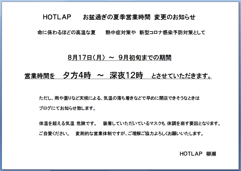 こんばんは HOTLAPですーお盆休みも ありがとうございましたもっと早めに書こうとしてましたが 深夜営業あけ寝て起きたら こんな時間('Д') 多分 毎年 すごい気温になっていくんだろうなと思いつつこれが毎年 夏の時間になっていくのかなと思いつつ営業体制を考えました よろしくお願いします遅い時間の書き込みすいません 明日からお願いいたします予定では 23日(日)タミチャレ青になっています が そこだけ調整中です22日(土)にナイタータミチャレ青(夜8時から) 開催が有望になってきていますすいません お待ちください<(_ _)>では 酷暑8月 よろしくお願いします