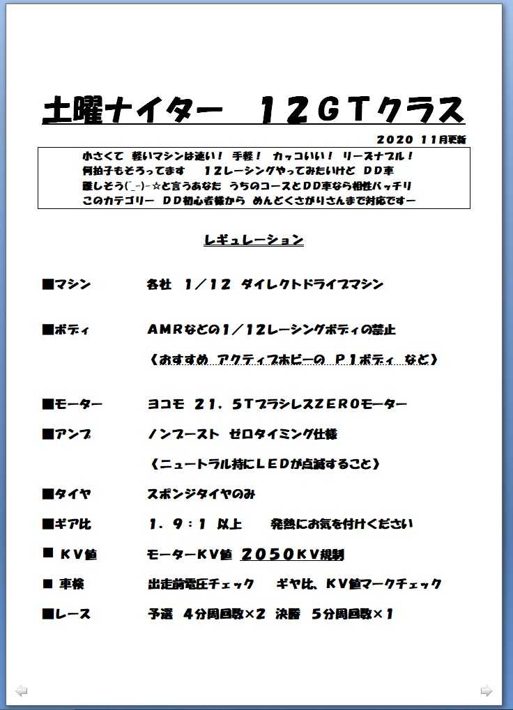 こんばんは HOTLAPですー来月、12月より 使用していただくレースのレギュレーションを更新させていただきました書いてませんが 一応12モデ以外のレースは すべて2セルバッテリー使用でございます12GT F1は 出走前電圧の車検がなくなりましたノンブーストツーリングは 出走前電圧車検の廃止 車重1280グラム以上規制タイヤを ラッシュ30CPMに固定 が追加されましたフレッシュマンは 車重1280グラム以上規制 タイヤの自由化を追加しましたフォーミュラE+@ は 名前をフォーミュラE+GTに変更しただけです12モデは書体を変えて 書き直しただけですレギュ追加、変更実施は12月の第二土曜ナイターレースよりよろしくお願いします(12月12日からですね)告知 12月27日(日)に今年最後のレースを開催させていただきますカテゴリーは 12モデファイ ツーリングノンブー ツーリングフレッシュマンタミチャレライダー の予定昼間のレースです お暇作っておいてくださいね