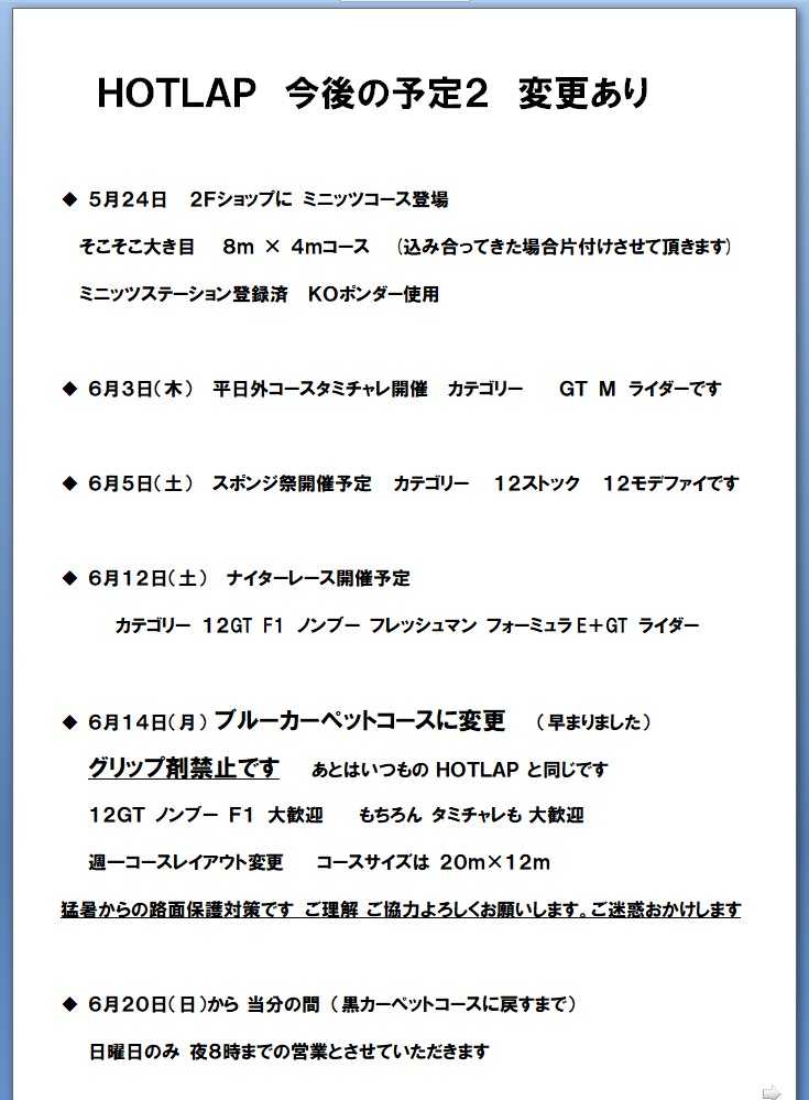 こんばんは HOTLAPです今後の予定を 煮詰めていきました早まった梅雨や 簡単に30℃を超えていく気温 手伝ってもらわないと敷けない300キロのカーペット いろいろありまして予定を更新させていただきましたまず 26日予定だったスポンジ祭を 5日(土)に変更でお願い致します6月後半は 路面確保が難しいと判断しました カテゴリーは 2つ 12モデファイ と 12ストック ですよろしくお願い致します14日(月)にコース改修させていただきますお手伝いありがとうございます 一人ではビクともしません あの青い子よく タミチャレ専用になるの? と聞かれますが 全くそんなことないですグリップ剤を使わないでください と言うだけで あとはいつもと同じですコースサイズが小さくはなります いろいろ走って試してみてください12GT F1 もちろんタミチャレ 12ストックは走れるかな? 無理かな?楽しんでください(^^♪3か月くらい青カーペットになります 多分 毎年こうなっていくと思います去年までは自分 暑い夏早く終われー と思ってましたしかーし 今年からは 夏のラジコン楽しいねー に変えれるよううちも頑張りますので 一緒に遊んでください(^^♪いろいろ変更 すいません よろしくお願い致します
