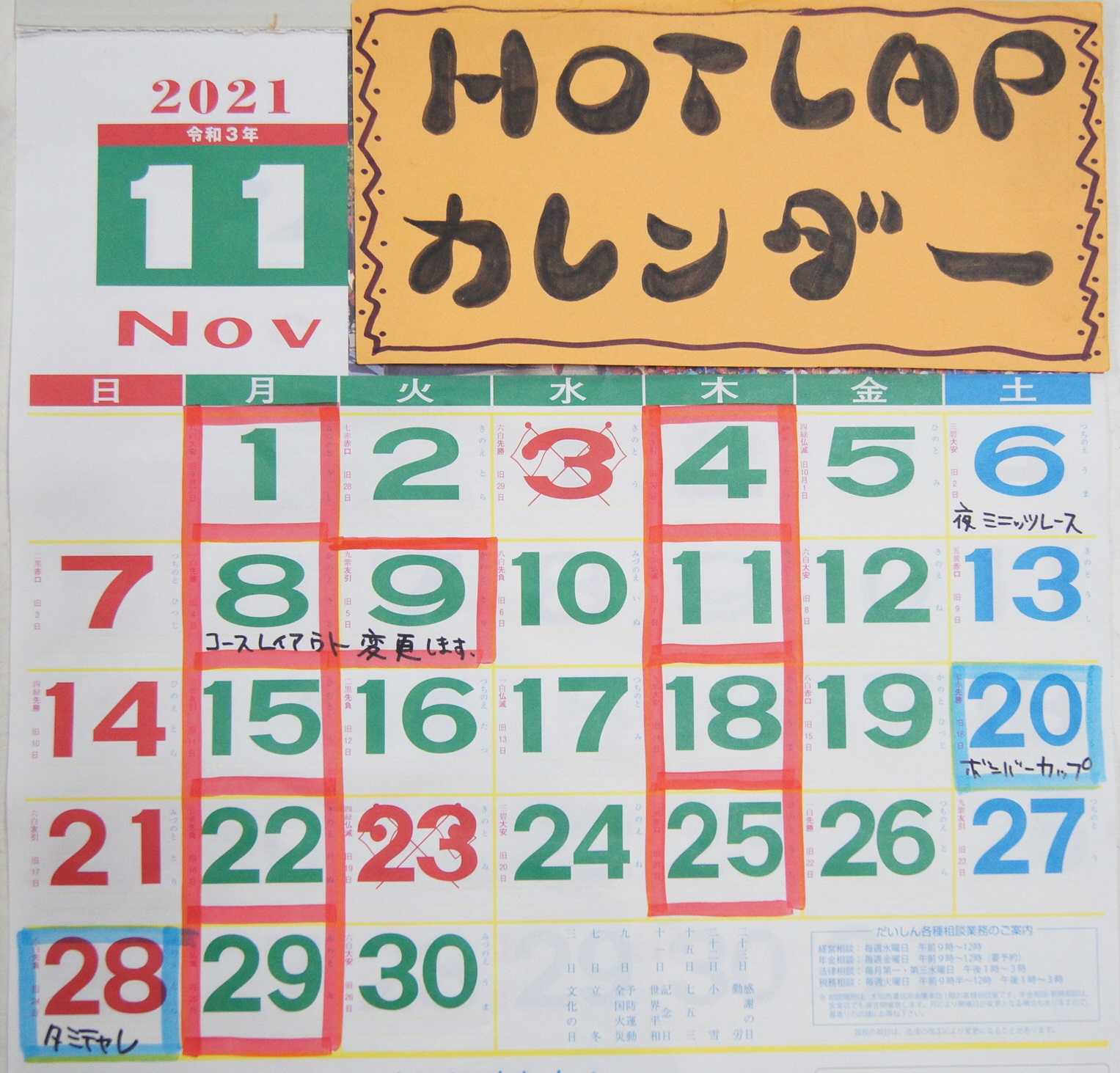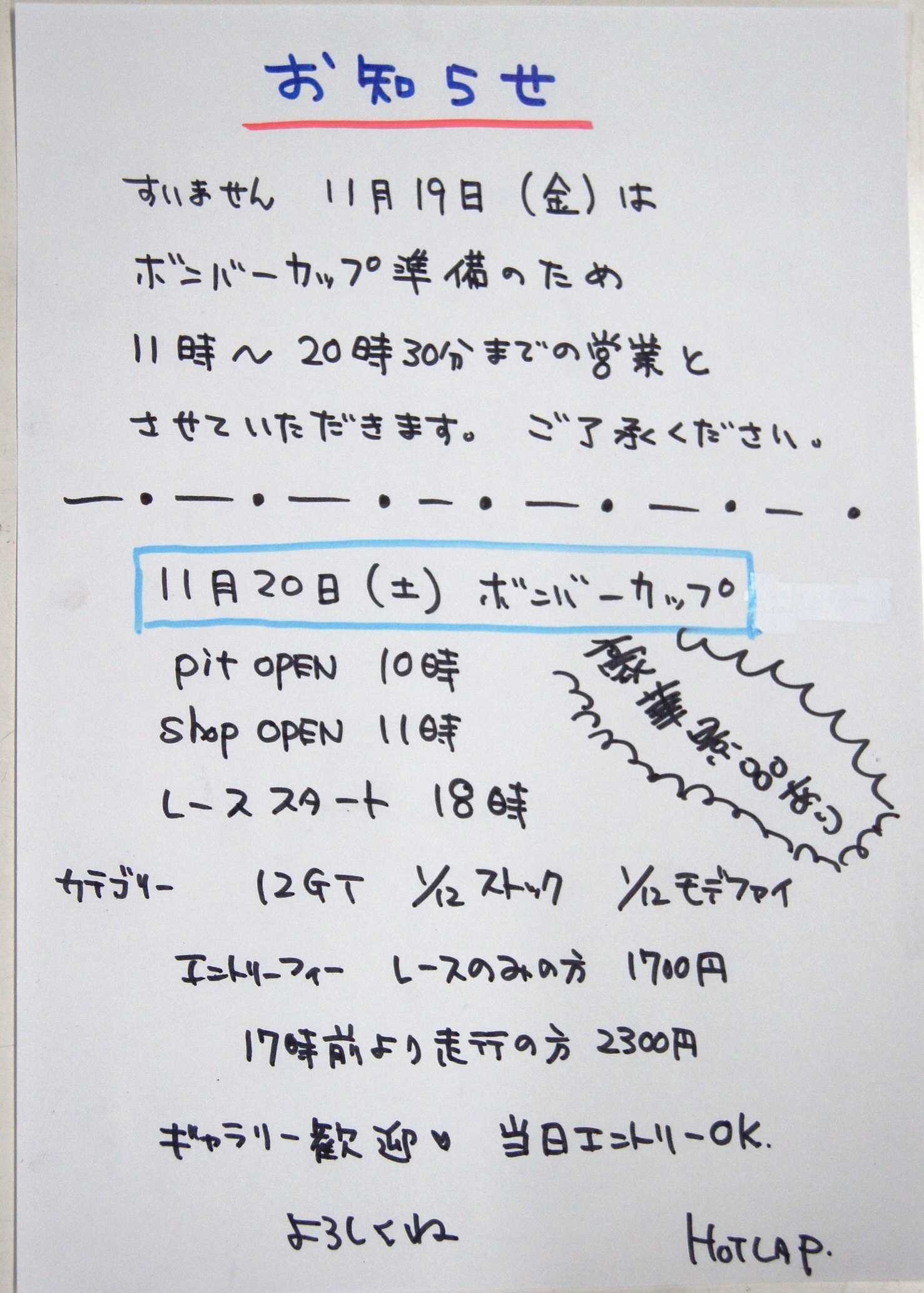 こんにちは HOTLAPです11月の予定カレンダー見てくださいね('ω')ノまず 6日の夜に2階ショップにて 京商地元カップ(ミニッツ)がございます2階のコースでやりますので 下の本コースは走れますので 大丈夫ですノービスクラスと ワイドクラスです お気軽にご参加よろしくです8日 9日お休みいただいて コースレイアウト変更させていただきます20日(土) BIGイベントです ボンバーカップがございます12GT と 12ストック と 12モデファイがございますエントリー受付中 よろしくです28日(日)タミチャレ開催の予定をいれてみましたカテゴリーは GT M TRF E ライダー ZEROビギナー の6つお昼のレースです よろしくですでは11月 新製品もいろいろ出てきます 楽しみましょう(^_-)-☆