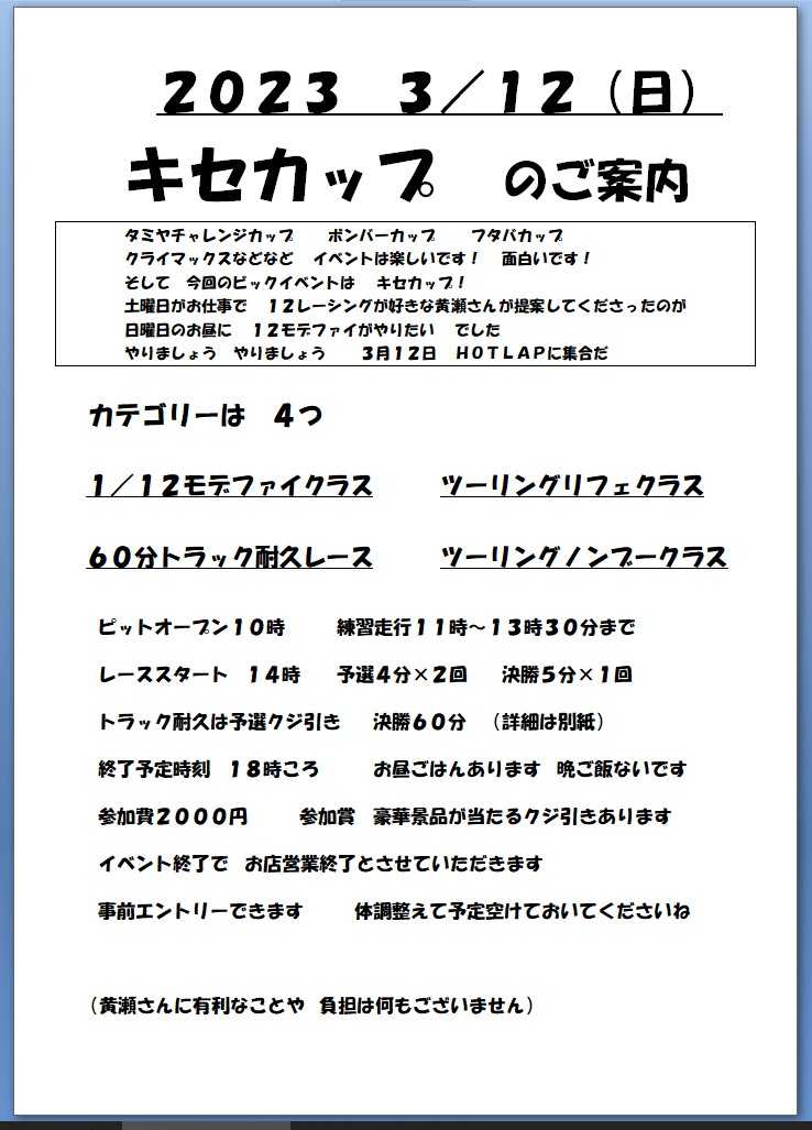 こんばんは HOTLAPです(^^♪12日に キセカップが開催でございますカテゴリーは 4つ1/12モデファイクラス ツーリングカーノンブーストクラスツーリングカーリフェクラス 60分トラック耐久 ですエントリーは当日もOK10時にはピットあけれます13時30分まで練習走行できますお昼ごはんあります 晩ご飯ないですレース終了でお店の営業終了とさせていただきます すいません重要なこと 1 前日 3月11日(土) キセカップ準備のため営業時間を 20時 までとさせていただきます よろしくお願いいたします準備したあと 大垣の有名店 ひょうたん に集合 というのはどうですか?お待ちしておりますすごく重要なこと 2キセカップ・・・ キセさんだから キセカップなんと 急な仕事入り キセさん これません!!! ('Д')びっくりでしょ(*´з`)キセさん くやしがるくらい盛り上げて楽しみましょー よろしくね