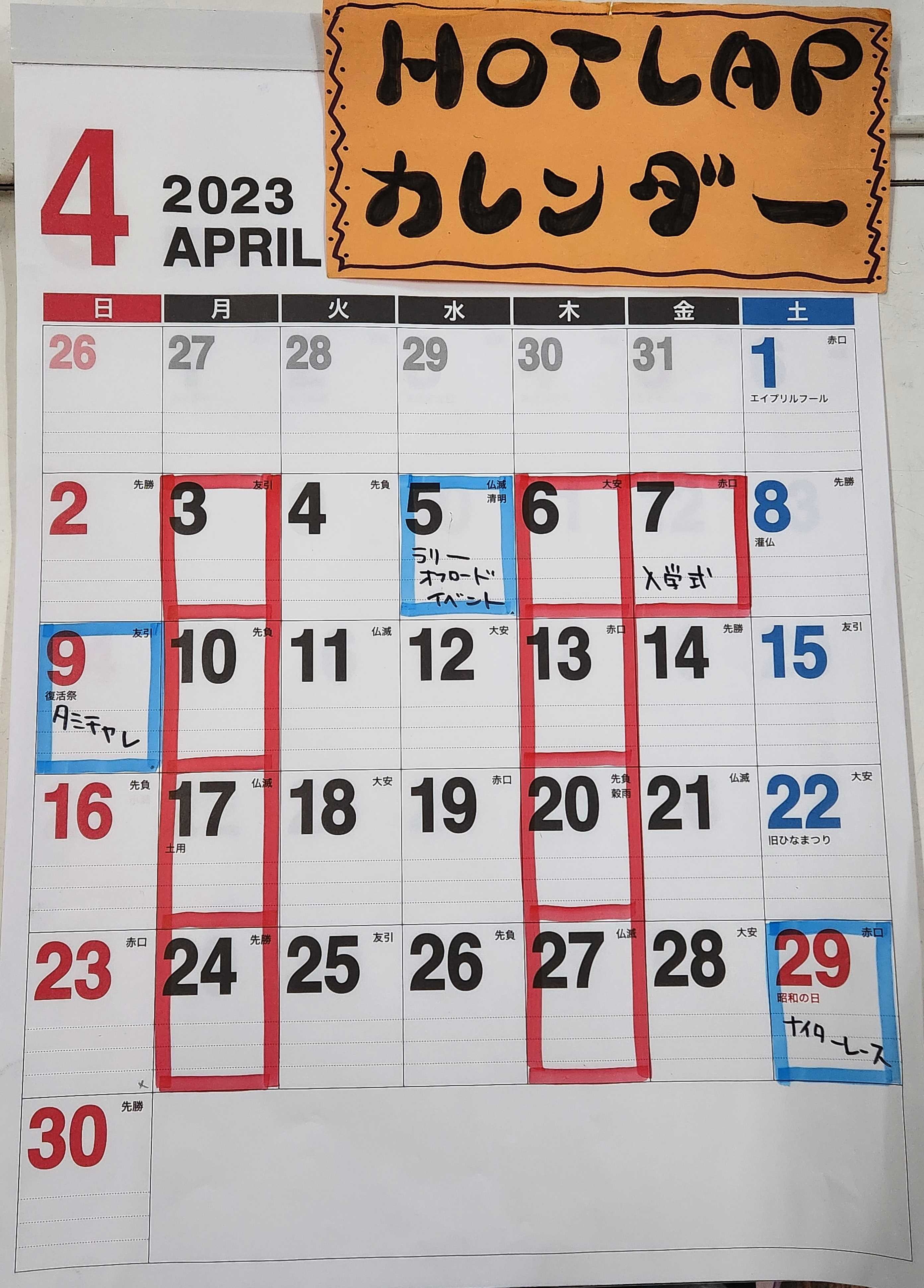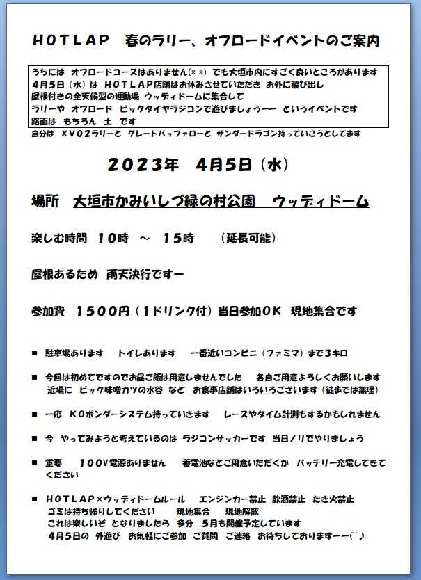 こんばんは HOTLAPですー4月のカレンダー 見てくださいねまず 5日 大垣のウッディドームで オフロード ラリーで遊ぼうがございますー当日参加OKOK 親子割もあります 現地集合現地解散でビック味噌カツの水谷は 水曜定休でしたおすすめもう一か所 ひまわり畑 です 朝6時からやってますお昼はバイキングもあるご飯やさんです僕は 弁当持参でいこうと思ってます 藤田くんは ひまわり畑に食事にいくと言ってました(^^♪ 自由走行ですが 一応 参考までラリー 自分は タミチャレラリーのレギュでいこうと思ってます10.5Tではなく 走行時間長めの 15.5Tを装着 リフェで走りますバギー ジャンプ台も持っていきます 飛びたいので 13.5Tモーター装着予定ピット コース の予定表ラリーと バギーでコース2パターンできるようにしますよろしくね7日(金) 入学式のため お休みいただきます<(_ _)>9日 タミチャレがございますカテゴリーは 6つ ZERO GT GTフレッシュ TRF ライダー Mですコースレイアウト タミチャレ専用に変更しようと思ってます楽しみましょうーー よろしくね(*^^)v29日(土) ナイターレースの予定カテゴリーは4つ 12GTR ノンブークラス フレッシュマンクラスリフェクラス そして 15分トレーラーヘッドクラス15分て('Д') では 4月よろしくです
