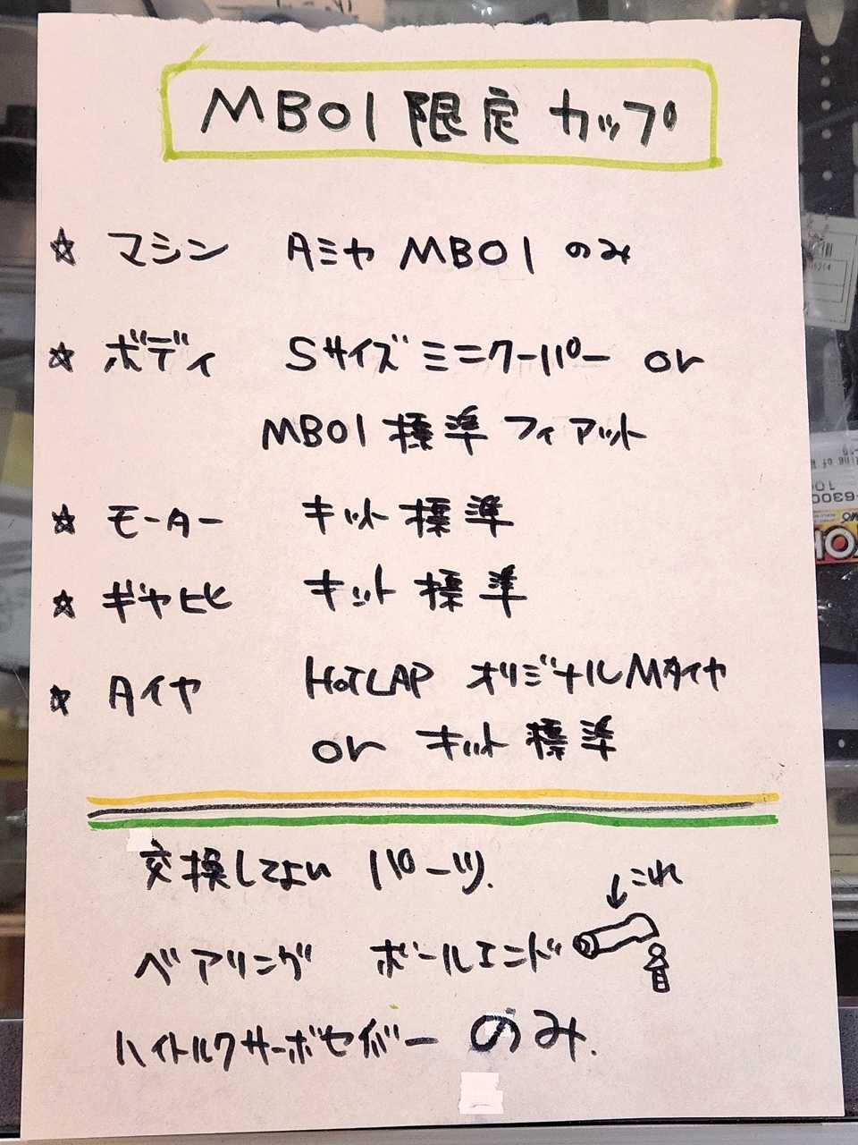 こんばんはー明日 9月10日(日)タミチャレがございます涼しくなってきてはいますが まだ昼間は暑いので 今年最後の早朝レースですピットオープン 朝6時30分 練習開始7時 レーススタート 8時くらい予選1回 決勝1回 です すみません エントリー料金お一人1000円当日エントリーOKOK お気軽にご参加よろしくね喫茶のモーニングサービスあります モーニングセットとドリングで500円今回は20セットほど用意いたしました売り切れの際は ごめんなさい<(_ _)>参加賞 出します お菓子とドリンクです最後のクジ引きもありますカテゴリーは 7つ 6つになりそうな気がしますが('Д')GT M ZERO GTフレッシュ TRF ライダーそして 初 MB01限定レース 朝はやいです 気持ち良いですよ 12時前くらいには終了予定 その後 閉店 解散 となりますレース終わったのに まだ お昼前 いろいろできますねーよろしくお願いいたします10月は ちょっと日程が変わると思われ11月の全国統一タミチャレは うちは 5日(日)に開催となります今後もよろしくね