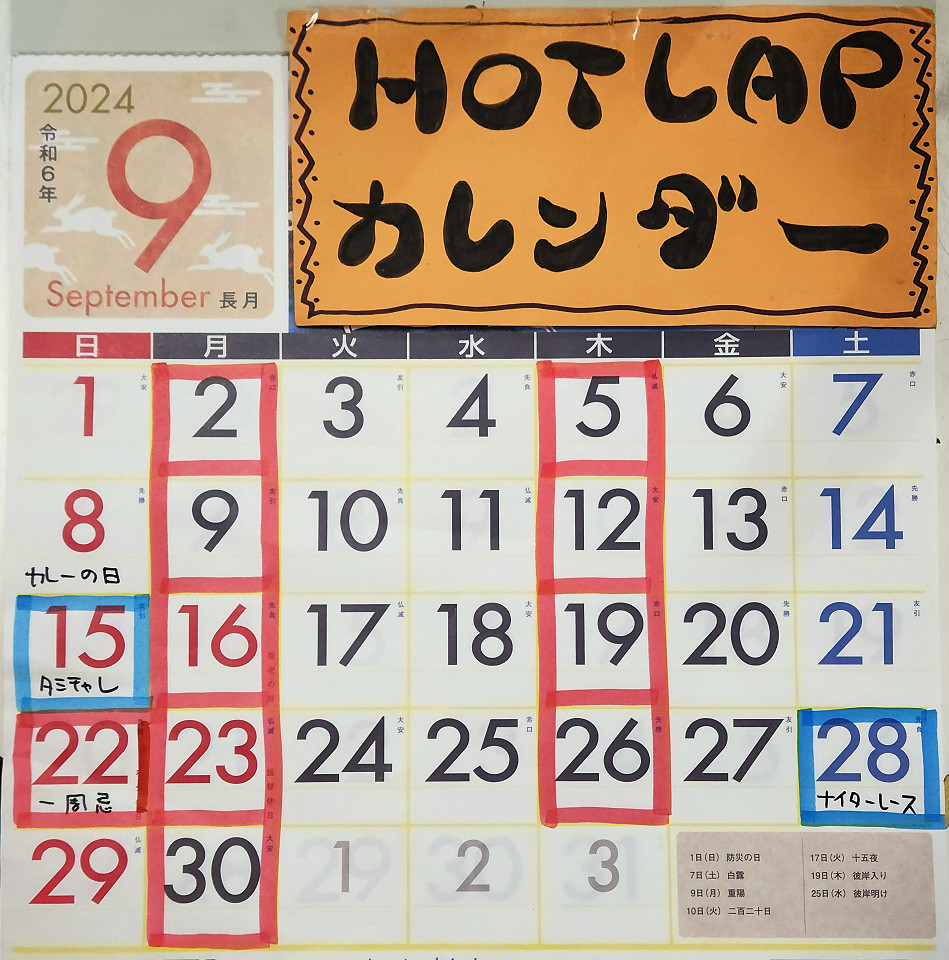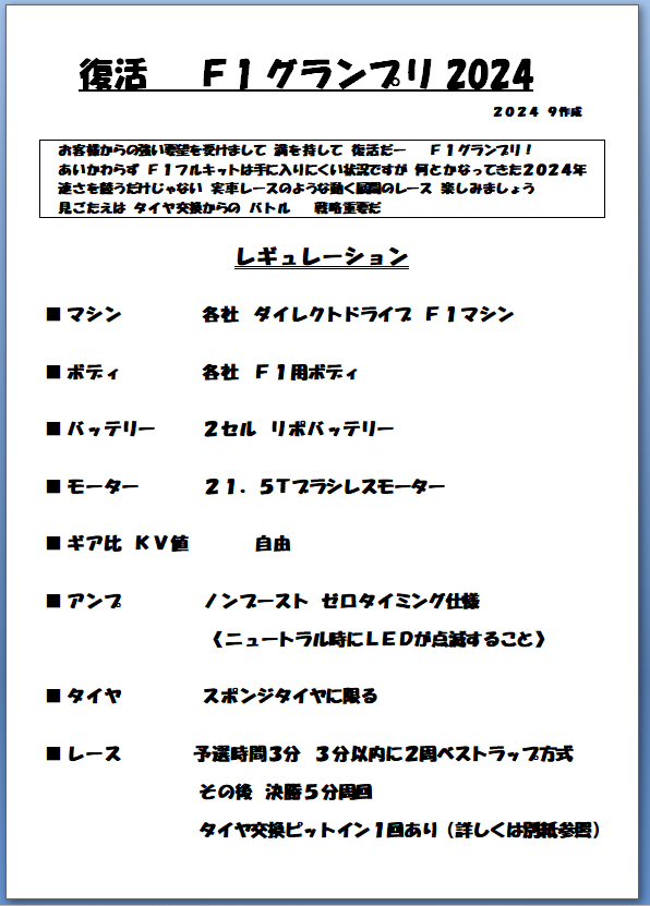 こんばんは 杭瀬川氾濫で浸水しかけたHOTLAPですあぶなかったです( ;∀;)9月 よろしくねまず 8日(日) お食事がカレーのみ (昼も夜も) です よろしくです15日(日) タミチャレがございます 鋼枠少し涼しくなったということで いつもより1時間だけ遅らせて 7時ピットオープン7時45分練習スタート その後レースへ という感じです今回は いつものケアフリー的な感じと違い インドア黒カーペット路面でいかせてもらいます(コース設置体力時間睡眠不足問題です すいません 10月はがんばります)カテゴリーは タミチャレGT TRF GTフレッシュ ライダー KIMI の5つでモーニングセットのご予約は9月11日(水)まで よろしくです22日(日) 一周忌のためお休みいただいております28日 ナイターレースがございます久々に F1レースが復活 レギュはもうすぐだします よろしくね9月 まだ暑いですが楽しんでもらえるよう頑張ります(^^♪