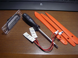 装着編です(´∀`)念のためのお約束事項です。 模倣された場合のいかなる事態も、責任は負いませんので悪しからず。 エーモン 1497 リムーバー(3本セット)一式。あ、はさみと両面テープが写ってないわ。LEDChip側に両面テープが付けてある所を見ると、このように取り付けるのがデフォルトのようですが…LEDの発熱が気になるので、レンズではなくケースに取り付けることにしました。その前に極性を確認するために試験点灯。左と右。ここで極性を確認して、ソケットをケースに嵌めたまま作業しました。こんな感じです。Chip実装面の反対側に両面テープを二重にして貼り付けました。ケーブルの逃げ。ケーブルの切り貼りは面倒wなので、トグロを巻かせて貼り付けました。あんまり良くないのだろうけど(;´Д`)…先日の写真と比べると、純正球の位置と同じくらいに見えます。念のためChip側にもクッションテープを貼ればよかったかな…一応完成。LEDがやや奥まって、光の照射範囲が少し狭いかも知れませんね。あと、ケースが黒いので、白か銀色にでも塗れば更に明るく感じられるかも。最終試験点灯。良好です。装着点灯。思ったほど暗くないですね。もう少し暗くなるかなと思ってましたからね。時間が取れたら後日、夜間の点灯画像をアップします。 お約束事項を追記しました。