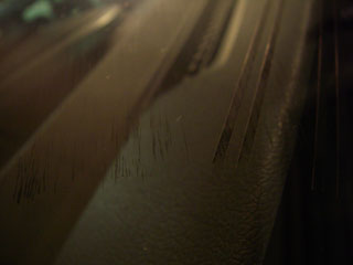 ビビリ対策っつか、これはいったい…(´・ω・`)この画像だと少し見え難いですね。こちらだと分りやすいですね。運転席側のワイパーブレードの下側って言うのか内側って言うのか…この辺りを中心に、画像のように汚れています。この汚れ、擦っても落ちないんですよ(;´Д`)粘りが有ってこびり付いています。で、結局アルコールで拭いたら取れたんですけど、ブレードゴムがどうやらおかしいのではないかと思っています。過去に撥水コートやセーフサイトでこのような状態になったこともないし、ブレードゴムを触ると少しべた付く感じなんです。断定は出来ませんけどね。ビビリ対策とかwそれ以前の問題発生ですわ(´∀`)先ずは、新しいワイパーブレードを入手しなければ。