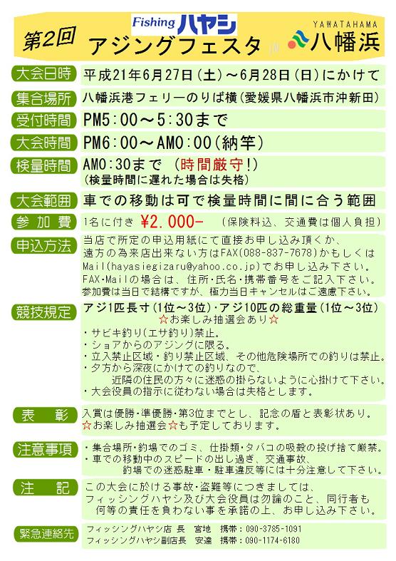 アジングファン待望の、「フィッシングハヤシ主催 第2回アジングフェスタ」の開催が決定した模様です。6月27日(土)の17:00から受付け開始みたいですね。あー、参加したい。けど、その日は間違いなく仕事が・・・・・。無理だろうなぁ・・・・・。(涙)せめて検量時間に会場には行ってみたいですね。(笑)詳細は「フィッシングハヤシ」さんのホームページで確認をお願いします。にほんブログ村
