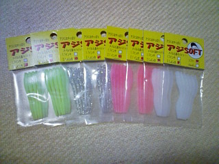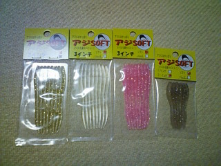 先日、C.C.Bait'sさんからモニター商品として頂いたアジソフトですが、楽天で3インチを発見しましたのでさっそく捕獲してみました。左から、クリアゴールドラメ、クリア、ピンクラメ、一番右は2.1インチ限定カラーのイカナゴです。この3インチ、2.1インチと比べるとかなり大きく感じますが、ギガアジだけじゃなく、豆サイズのアジやメバルなんかも、ワームを折り曲げるような感じでバイトしちゃってますね。実績からみてもポテンシャルは十分だと思います。あとは僕の腕次第でしょうか??(笑)にほんブログ村
