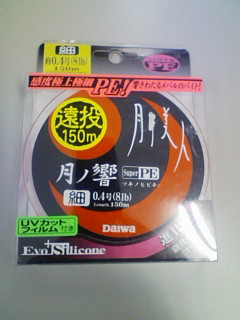 明日のアジングに向けて、何か良い物はないかとヤフオクを徘徊していると、以前から興味はあるのに高いという理由で見ない事にしていた物を発見!!しかも43%オフの4000円即決じゃないですか。出品が同じ愛媛県という事もあり、土曜のアジングに間に合うので迷わずポチッっとしちゃいました。(笑)そして到着したのがこいつ、DAIWA 月下美人 月ノ響 0.4号特に珍しくもない、いまさら紹介するような物でもないのですが、ネタもありませんので・・・。(笑)今までは、バリバス ライトゲーム メバル PE 0.3号をメインに使っていたのですが、根掛かりが多いポイントでボトムを攻めていると、リーダーじゃなくPEのほうから切れる事が多いんですよね。そうなると現場でシステムを組み直さないといけないので時間もロスしますし、家と違って暗いし、風もあったりで、どうしても時間が掛かりますし・・・。初めて使うPEなので、どんな感じなのか分かりませんが、ダメならエギングで使っても良いですしね。とりあえず、明日のアジングで試してみます。にほんブログ村