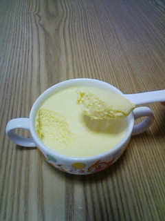 土曜日の夜、本当は釣りに行きたかったのですが、家に帰ってみると1歳の息子が38度5分の熱を出してダウン。もともと潮もそんなに良くなかったので、あっさりと釣りを諦めてちゃんと息子の看病をする事にしました。(笑)朝起きて息子の熱を測ってみると38度8分なのですが、思ったより元気そうで早くも朝ごはんを要求してきます。(爆)食欲もありそうですし今日は何処にも行く予定がないので前々から作ってやろうと思っていた「かぼちゃプリン」を作ってあげる事にしました。実はうちの息子は卵アレルギーなので、周りの子供たちがブリンとか食べてる時に、かぼちゃやサツマイモを蒸かした物とかを持って行って食べさせるのですが、なんだかちょっと可愛そうなんですよ。当の本人は、かぼちゃもサツマイモも大好物なので気にせずバクバクと食べるんですけどね。(笑)そんな感じで、卵を使わず見た目がプリンみたいな「かぼちゃプリン」を作ってみる事にしました。ネットで調べたレシピは、1 かぼちゃ180gをレンジで柔らかくする(約5分)2 そのかぼちゃを裏ごしする。3 ゼラチン8gを水で戻す。4 お鍋で牛乳150ccを弱火で温めて、水で戻したゼラチンと グラニュー糖40gを入れて溶かす。5 2のかぼちゃに4の牛乳を少しずつ加えて混ぜ合わせる。6 生クリーム150mlにグラニュー糖10gを入れて、7~8分 立てになるまで泡立てる。7 5に6の生クリームを加えて良く混ぜ合わせ、再度裏ごしする。8 適当な器に注いで、冷蔵庫で1時間以上冷やして固める。そして出来あがったのがコレ厳密にはプリンというよりも、ムースとババロアの中間みたいな感じなのですが、初めてにしては上手に出来たと思います。(笑)あとは息子が食べてくれるかどうかなのですが・・・食べてくれました。(笑)レシピでは牛乳にグラニュー糖を40g入れるようになってますが、息子の健康を考えて20gにしてみましたが、かぼちゃの甘みも手伝って十分に美味しかったですよ。とっても簡単なので、興味のある方は是非作ってみて下さいね。にほんブログ村