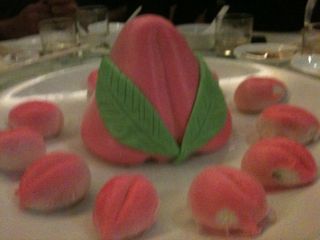 中華系のパーティーで、出てきたスィーツ。お誕生日の時しか出てこない限定盤だって。 桃のカタチのおまんじゅう。中は、日本でいうと、白いんげんの餡のようなマレーシアにしては、あっさりお上品なお味。(だいたいマレーシアは暑いので、なんでも極端に甘い)でも、この真ん中の大きいの、誰が食べるの?ただの張りぼて?。。。と思いきや。。。ひゃぁ~~~~っっ出でぎだぁぁぁ~~~~っっ びっくりして、ひとり大騒ぎで写真撮ってるワタシを円卓を囲んだみんなは大笑い。チャイニーズならみんな知ってて当たりマエなんだって~~~。