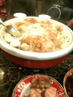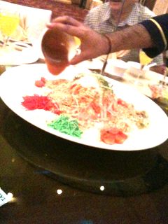 ほえぇぇ~。。。呑んだ呑んだ。まだ酔ってますったら。いえね、お金持ちのおっさんたちに呑まされたワケではないんです。確かにね、サー初着物でしたからそれはもう、あっちこっち引っ張りだこで奥さんに「オマエはあっち行っとけ。」なんて言ってまでワタシたちと一緒に写真を撮りたがる人までいました。サーは初めて、いつも「客寄せパンダ」やってるワタシの気持ちが分かったみたい。でも、すごく喜んでくれて今回は「恥ずかしい」といって履かなかった袴も、次回何かのパーティーで挑戦するんだって。その時はワタシもお振袖にしよう。今回のパーティーは、中華系の人たちのメインイベント旧正月の直前ですから(つまり彼らにとっては今が師走なワケね)この時期にいただくお料理がいろいろ出ましたよ。これね、イーサン。日本でも「中華風刺し身」とか言って最近知られるようになったけど今回は、「フルーツ・イーサン」とか言うヘルシーなもの。実は、マレーシア独自の食べ方がある。みんなで立ち上がって、ぐっちゃぐっちゃにかき混ぜるの。高ぁく高ぁぁぁぁく持ち上げてね。で、食べる。合成着色料のオンパレードです。でも、たくさん食え、と言われる。たくさん食えば、たくさんマネーカムカムだ、と。さっき高く高く持ち上げたのも、高く持ち上げれば上げるほど、マネーカムカム。チャイニーズ、しあわせ=マネーカムカム、ですから。わかりやすっ。定番フカヒレスープも、アワビ入りとゴージャス。マレーシアでは、黒酢を入れていただきますよ。おサカナのあんかけも、尾頭付きがマスト。こんなサカナよ。怖いでしょ。こちらも、ずばり「マネーバッグ」。蟹あんかけで、豪華版。ホントにマネーカムカムしそうだね。他にも、海老とかチキンとか色々あったけど別にビジュアル的にどうよって感じだったので、写真はナシ。マレーシアはいつでもチキン。どこでもチキン。お金持ちでもチキン。宗教関係なく誰でも食べられるからね。それから、無事パーティーも終わり、ホテルのロビーで呑み直している時にサーが、一人呼び出せ、と言い出した。サーが前の会社で、手広くレストラン事業を広げ始めた頃サーはその都度、板前さんたちを自分で面接し日本やあちこちから連れてきて給料の交渉から、条件の改善まで全てシンガポールにいる、ろくでもねェ社長とかけあっては一人ひとり、家族も含め、面倒見てきた。サー自身にどうしても我慢の限界が来て、ろくでもねェ社長の元から去ることになった時もこの、ろくでもねェ社長&愛人(愛人に会社任せるあたりがろくでもねェしょ)の下でこれからも働かなくてはいけない板前たちを心から気にかけ、外から守れることは守ってやってきた。結局一人を残して全員会社を辞めてしまったけど今でも全員、サーを慕って頼ってきている。つまりサーが呼び出したかったのは最後に残っている一人。パーティー会場のホテルの中に、彼が働く和食の店がある。サーは、とにかく彼のことが心配で仕方がないらしい。働く人間を、ただの使い捨ての駒としてしか扱わないろくでもねェ社長とその愛人の下でさぞかし苦労をしているのではなかろうかと普段はなかなか会う機会もないのでこういう近くまで来た時くらいは、話しでも聞いてやりたいなと思っているのはよく分かっていた。ので、ワタシが代わって電話をかけた。残念ながらもう仕事が終わって家に帰っていたのだけどあちらも、サーに会いたかったようでわざわざ奥さまに車で送ってもらって、ホテルまで戻ってきた。そっからはもう、オトコの仕事の話し。ワタシも首つっこんで話しはしてたけどまあまあ、そこで随分呑んだワケなのだよ。で、今も気持ちがワルイ、と。つまりはそうゆうことです。もう胸元はだけちゃってるアイールさんだけど3人とも、とっても楽しそうな顔してるでしょ。