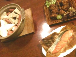 昨日は、サーの体調がすぐれず(前日呑み過ぎただけだ)結局、新年会には行きませんでした。助かった~~~。。。。んであるけれど、なんたってサーはいつでも急な人。教える方と習う方のフラメンコ、どちらも昨日はステップ重視の激しい内容。2時間半終わって帰ってきて、さて、と出かける準備。。。などと思った矢先の電話だった。「今日は行かないことにする。」午後5時。。。もっと早く言ってくださいっちゅに。出掛けるつもりで、晩ごはんの用意など、なぁ~んもしてないですったら。娘には、たまたま昨日作ったロール白菜があったし。先日市場での戦いに負けたワタシはお買い物もできなかったし。また、冷蔵庫なぁ~んもないし。しかも、すんごい疲れてるし。うちって、なんかいっつもこのパターンじゃない???で、なんとなく、やる気になれないまま、作った晩ごはん。冷凍庫にあった練り物類で、おでんのようなもの。冷凍保存してあったホウレン草でおひたし。わが家のお助け食材紅鮭。これだけは大量に仕込んであった、世界最強ザンギ。それでもね、作るとなればそれなりに一生懸命家族に美味しいと思ってもらおうとがんばるワケだな。美味しいと思ってもらいたいから本当はもっと時間をかけて献立考えたり手間ひまかけたりしたいもんなのだよな。なんて考えながら大急ぎで作り、とりあえずテーブル並べてブログ用に、娘に写真を撮ってもらった。。。。結果がこれだ。なんかさあ、もちょっとまとめて撮れないかなあおかあさんのやる気が全く伝わってこないじゃん、これじゃあ。なんで、ホウレン草とか冷や奴とかも一緒に写さないワケ?なんすか、このごった煮は。。。シラタキだー、ちくわだー、ごぼ天だー、全部下になってて見えないじゃん全く、向き反対ジャン茶色いザンギに茶色いお皿ってどうよくっつくクッキングペーパーってアリエナイからマレーシア製品ってこういうものです。そう。もう、全く不機嫌極まりないったらありゃしない。どいつもこいつも、全然美味しそうじゃない。ホントはこんなところに載せたくなんかなかった。。。。けど、すごく頑張ったのでお披露目したかったんだもん。。。でもね、結局週に一度はこんな食事ってあるかも、ってくらいうちっていつでも何でも急なお宅だ。急いで決まる。急いで出かける。急いで出かけないことも決まる。これが自営業っつもんです。別名、不自由業、とも言いますけど~~~