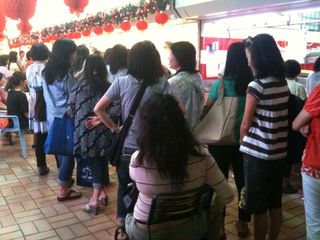 今日、お弁当を作って娘を送り出した後サーの用事で、市場へ行きました。日本人奥さまご用達の、日本人好みに豚さんをカットしてくれる豚さんご法度イスラム国家においてはかなり重宝な豚やさんが入っている市場。ところが、行ってビックリ!!!もう巷はすっかり、お正月前の買い出しムード。ここの豚やさんも、長い休暇に入ってしまうので日本人やら、中国人やら(豚屋なので、マレーもインドもいない)がお正月前の買い込みに来ていて、ちょー満員!豚売場コーナーの、どのカウンターにも人がいっぱい順番を待っているのです。。。なのに、見て!この整然と並んだ長蛇の列。これ全員日本人ですから!!!ちなみに手前で椅子にふんぞってんのは中国人豚売場の中でも、この日本人が並んでいるカウンターが日本人向けに、トンカツ用だ、しゃぶしゃぶ用だと切り分けてくれる店。でもって、奥の別のカウンターにぐちゃぐちゃっと脈絡もなく立ってんのがやっぱり中国人。この差はナニ?そして、この豚売場にワタシの後から入ってきた人たちを見ていると日本人黙って列の後ろに並ぶ中国人とりあえず一番前へ出るその差、歴然もう~~~、拍手喝采したくなった。キミ達、素晴らしい!ニッポンジン魂ここにありだ!マレーシアの人間たちに、道徳の差を見せつけてやりたまえ。そう思った。あ。。マレーシアの人これ見てたら怒るよね。でも違うんだもん。分かってるんでしょ、自分たちも。で。。。きちんと順番(この状態だと確実に2時間は待つ)待ちする日本人にもなれず人を押しのけて我先に自分の分を買い漁る中国人にもなれないナニジンだか分かんないアイールさんこの気配に圧倒されてすごすごと退散し誰もいないスーパーマーケットで高ぁ~い豚さん買いましたとさ。。。