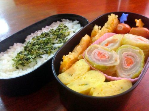 ウワァァ-----。゚(゚´Д`゚)゚。-----ン!お寝坊さんでした今日から娘だけ少し早く出勤なので。そのつもりで、アラームもセットしてたはずだったんだけど。運転手に10分待ってもらって10分で完成させたお弁当。せっかく娘が撮ってくれたので2枚とも載せちゃいます。肉巻き白菜を、昨夜のうちに用意しておいて助かった。それでも、かぼちゃの天ぷらを揚げてシャウエッセンを焼いて、青のりの卵焼き。結構、やれば出来るじゃんという感じ。でも、やっぱりお料理は時間をかけてかけられるにいいだけかけて、作りたい。そう思ったアイールなのでした。ただ。。。それにしても。。。「いってきま~す」と、お弁当持って運転手付きの自家用車で出勤していく娘。なんとまあ羽振りのいい丁稚奉公なのだろうかと笑った。