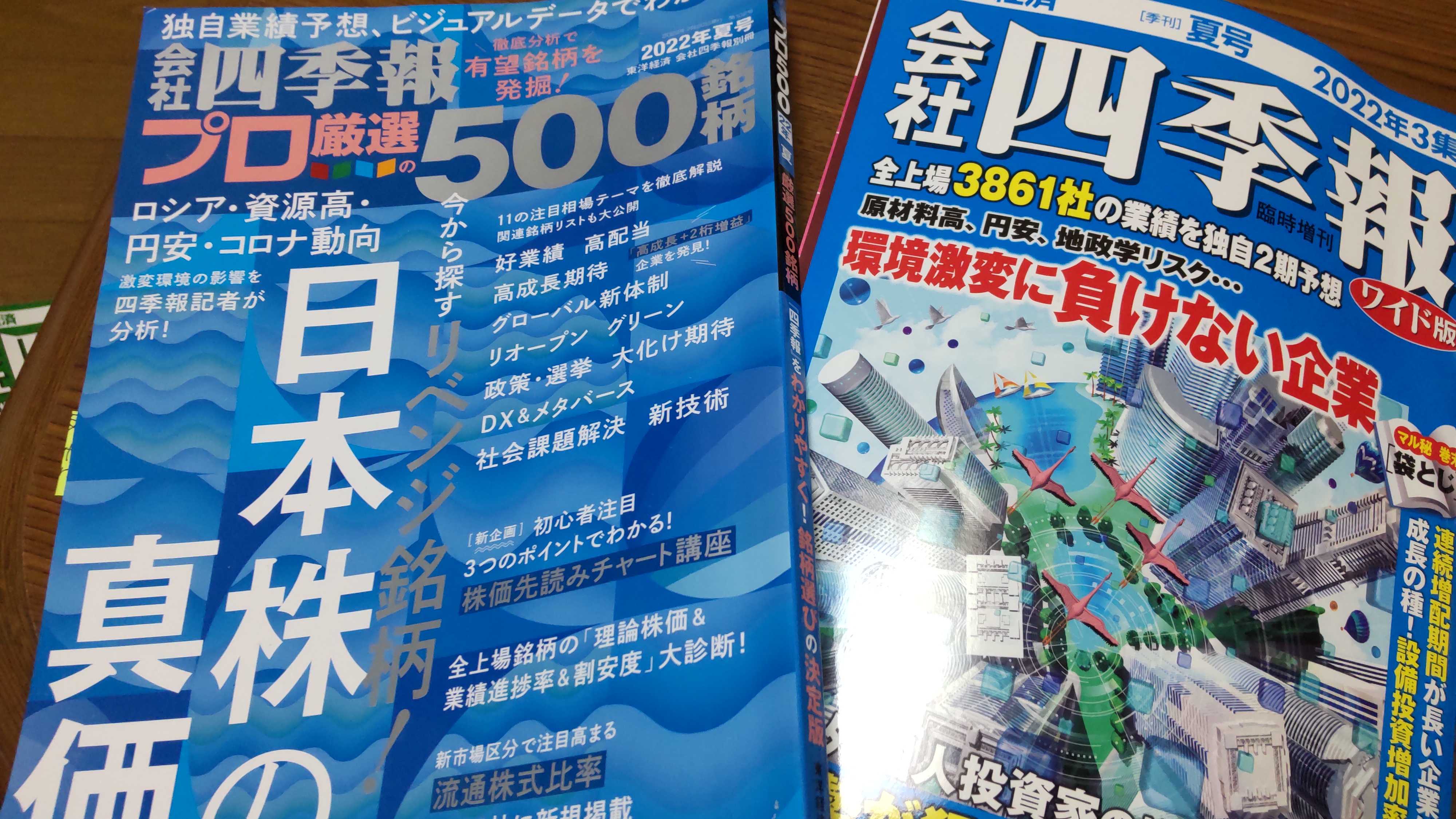 本日、商船三井で利益出た!\(^o^)/\(^o^)/利確が早すぎたが、仕方がない。しょぼしょぼと頑張る!!日曜日の午前中は、夫婦でウオーキングが日課ですが、私の兄弟姉妹の集まりがあり、別行動。母が亡くなって、色々と手続きがあって、書類に実印押しまくり。結婚したとき、まとまったお金をもらった私と姉は遺言通り、何も言わず、放棄,放棄、放棄。ここで、あたしがごてたらどうする!?お父ちゃんも、お母ちゃんも、悲しむな~(´;ω;`)兄弟姉妹仲良くですな!!!そして、旦那さんは、四季報を買いに行ったらしく、家に帰ったら、ボールペン耳に挟んで、読み込んでいた。四季報プロ500銘柄を買ったのに、見向きもしない。Σ(゚Д゚)Σ(゚Д゚)だって、旦那さんの保有銘柄、掲載されていないから!(;゚Д゚)最近、旦那さんのポートフォリオはウハウハなのでバフェット○○太郎と呼んでくれと、言ってきた。。。。。。。マジか!バフェット旦那さん。(;゚Д゚)(;゚Д゚)一寸先は闇ですぞ!そろそろ売ってはどうですか???会社四季報 ワイド版2022年3集・夏号 [雑誌]価格:2899円(税込、送料無料) (2022/6/27時点)楽天で購入