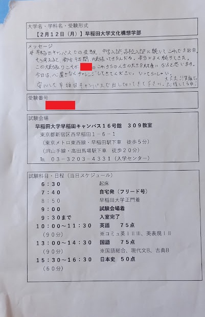 1年前の今日が、早稲田大学の文化構想学部の試験でしたね。早稲田大学の受験の初日で、おまけにのっけから第一志望の学部でしたが、高校受験や共通テストの時と同じく、君の瞳には静かな闘志が宿っているのを見て、安心したのを覚えています。とはいえ、高倍率の早稲田の試験。合否は紙一重だったと思います。日本史で、人間とうさぎの関係史の問題が出るなんて!うさぎ飼いの君を呼んでいるようなものではないですか!君が早稲田を選んだように、早稲田も君を選んだような気がしてなりません。このご縁を感謝して、大学生活を送ってください。もうすぐ、あれから1年。残りの大学生活もあっという間です。青春とは何かを成し遂げる時代ではなく、愚かで馬鹿をする時代だと思います。逆に、愚かで馬鹿をできるのは、学生時代の特権です。どうか、今のうちに失敗を恐れないで、様々なことにチャレンジしてください。そして、へこんだり、疲れたりしたときは、いつでも帰っておいで。今後の君のチャレンジに期待しています。