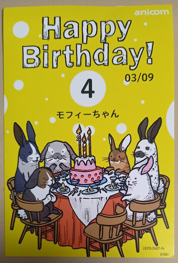 モヒうさぎさんあてに、動物損害保険のアニコムさんから、バースデーカードが届きました!正式名称のモフィちゃんあてのカードです(モヒはニックネーム(!?)です)モヒのカラーは、リンクスっぽい(子ウサギの時はフォン、その後オレンジを経て、現在に至る)ので、カードの茶色っぽいうさぎさんがモヒでしょうか!?いずれにしても、アニコムさん、ありがとうございます。モヒはこれまで一度も獣医さんにかかったことがなく、保険料金が割高な気もしますが、それでも嬉しいです。うさ飼いのバイブル「うさぎのための最高のお世話」によると、うさぎの4歳は人間の40歳に相当するとか!もはや、中年じゃないですか!モヒさん!一方で、うさぎさんも長寿命化しているようで、平均寿命を11歳とするとあと7年。加齢によって、うさぎさんにも変化が起こってくると思うので、動物保険はもちろん継続です。誕生日プレゼント、よろしくなのれす!(fromモヒ)