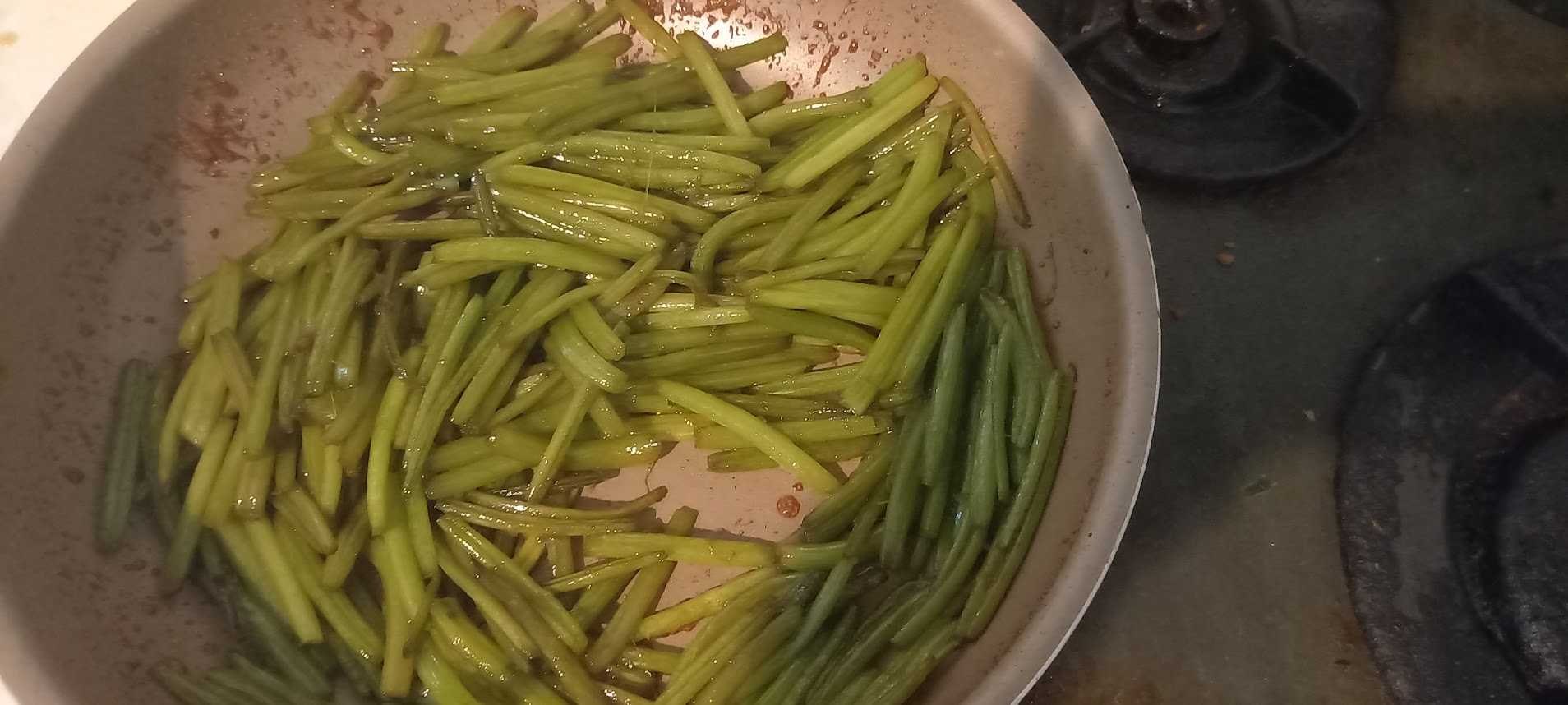 ちはら台の農産物の直売所「果彩菜(くださいな)」が楽しい。時に、初めて見るようなマイナーな野菜や果物が生産者の名前とともに並んでいる。そして、手書きで、その商品の解説や食べ方まで書いてあるから、ついつい料理してみたくなる。ある日、芋づるを発見。サツマイモの蔓をたぐると、次々と芋が連なって出てくることを「芋ずる式」という。その語源となった、芋づるだ。青々として、美味しそうだ。そして、見るからに鉄分や繊維が豊富そうだ。そういえば、農家育ちの母が芋づるのきんぴらを作っていたような記憶も。記憶とネット情報を頼りに、芋づるはキンピラになってもらうことにした。ごま油で芋づるをパラパラと炒める。つるが固いのか、なかなか柔らかくならないので、しっかりと。シンナリとしてきたところで、ショウガ(チューブですが・・・)を投入。そこに、みりんを多め、塩少々加えて、水分を飛ばす。みりんに加えて、つるからも水が出てくるので、やや長めに。最後に醤油をやや焦がすように加えて完成!早速、味見をしてみると。ーうーん、美味い!思った以上に美味い!本家・ごぼうのきんぴらにもひけを取らない美味しさ。少し甘味のあるところに、サツマイモの芋づるを感じる。こりゃ、たまらんとばかりに、早速、缶チューハイをあける。酒のあてにぴったり!先日、幕張でサツマイモ展が開かれたほど、千葉県はサツマイモの産地。そういえば、江戸時代(享保の改革・徳川吉宗の頃)に、青木昆陽がサツマイモを広めようとして、試作を始めたのも、幕張だとか。飢饉対策だから、芋だけでなく茎を食べることも考えていたに違いない。そんなことを考えながら、食べると箸がとまらなくなったのでした。