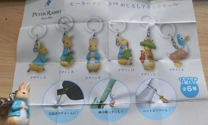 書斎や職場、あらゆる場所でうさぎに囲まれていたい。だから、うさぎグッズには目がない。しかるに、世の中、犬や猫に比べて、グッズの世界でもうさぎモノは少ない。だからこそ見逃せないのだ。過日、あたりに何かうさぎの匂いがするもので、ショッピングセンターのガチャガチャコーナーを物色していたところ、ありました!「ピーターラビットのめじるしアクセサリー」。どうやら中味は6種類。うち4つがピーター。1つがベンジャミン・バニー。そして、もう一つがアヒルのジマイマ。中を覗いてみると、残りがわずか。アヒルのジマイマしか残っていないのではないか(ジマイマさん、ごめんなさい。)、いやいや残り物にこそ福があるのだ。と揺れる気持ちを押さえながら、ガチャガチャのハンドルを回したのでした。そして、カプセルを開けて中を見る瞬間は、プロ野球ドラフト会議で、封筒の中からくじを取り出す監督(球団社長)の気分。結果、我が球団は、めでたく即戦力右腕(?)のピーターラビット投手(ノーマル立ち姿)の獲得に成功したのでした。ガチャガチャの前で、思わずガッツポーズなのであります。キーホルダーにつけて、大事にいたします。