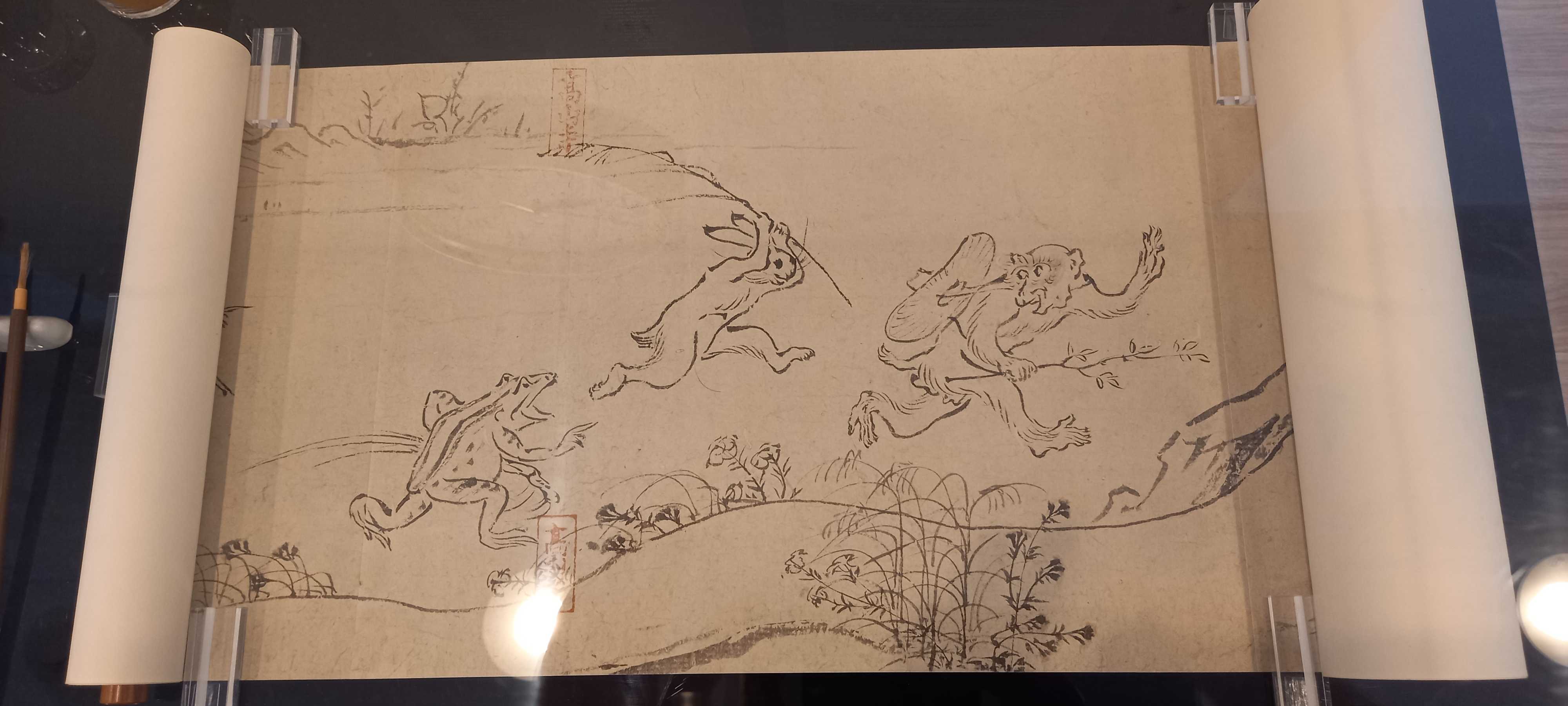 京都高山寺に伝わるという「鳥獣戯画」。もちろんホンモノを見たことはないけれど、生き生きとした動物が人間のように振る舞う愛嬌ある姿に惹きこまれる。中目黒の郷さくら美術館で、そんな鳥獣戯画に着想を得た作家達の作品展が開かれているというので、やってきた。竹内浩一さんの絵画は、どこか幻想的だけど、動物たちが生き生きと弾んでいる。「戯画 雨中鯰図」は夜行性の鯰(ナマズ)たちが、スッポン亀を囲みあたかも遊んでいるよう。そして、白ウサギたちが、そんな水の中のことは無関心に飛び跳ねているところがいい。「戯画 猿来迎」は、来迎図の阿弥陀さまの代わりを猿がつとめている。神妙な猿の表情が可笑しい。「戯画 釣り名人」も面白い。釣り糸を垂れる猿の背後を、魚を獲るのが得意そうなアオサギがお手並み拝見という表情で見ているのだ。平子真理さんのダチョウに乗った猿のレースは、ニンマリしてしまう。必死にしがみついている猿や、落馬ならぬ落鳥して、無念そうな猿の姿に、思わず微笑んでしまう。武蔵原裕二さんの「一〇八匹犬図ー走ー」も、楽しそうな犬たちに、口元が緩む。特に、柴犬好きなので、柴犬の表情に注目だ。動物たちの一生懸命な姿に和まされた。きっと、この作家たちは動物たちが好きでたまらない人たちなんだろうな、と思った。僕も、動物を好きなことにかけては、人後に落ちないが、いかんせん絵の才能がない。残念だが、見て楽しむしかない・・・。
