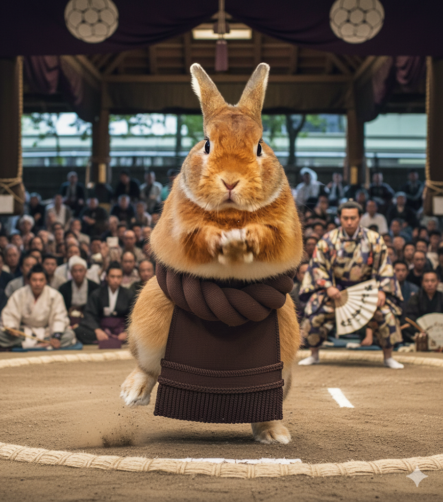 うさぎは可愛い奴と思われている。メスうさぎだったらいいけれど、モヒはオスうさぎ。オスは雄々しくありたいと常々思っている。そこで、モヒは、相撲部屋に入部した。モヒの入部したヤマ部屋には、桃太郎親方がいて、クマ関や、イヌ関、キジ関がいた。クマ関は右脚だけでモヒを踏みつぶすくらい大きかったし、イヌ関も尻尾だけでモヒを払いのけそうな勢いだ。キジ関は体こそモヒと同じくらいの大きさだったが、機敏でいつのまにかモヒの真上に飛びあがることができた。モヒは、来る日も来る日も、稽古でクマ関に倒され、イヌ関に押し出され、キジ関に上から突かれた。やっぱり、うさぎはうさぎ・・・。強くなるなんて無理だった。やっぱり、元の草原で、他のうさぎ達と可愛く生きていこう。幸い、クマ関もイヌ関もキジ関も、朝の稽古でくたくたになって、眠りこけている。モヒは、ヤマ部屋から逃げ出そうと、荷物の入ったリュックを背負い、そぉーとドアを開けた。ドン。突然、なにかにぶつかった。目の前に桃太郎親方がいた。親方は、逃げ出そうとしていることには触れず、座り込んでこう言った。「モヒどん、腹へってんでねえべか」親方は、懐からアケビとイチジクを取り出した。「こんなおいしいもの食べられるんだから、俺たち幸せだ―」モヒは食べた。甘いはずのアケビとイチジクがちょっとだけしょっぱかった。親方も食べながら言った。「モヒどんの後ろ脚で蹴られたら、俺だってただじゃすまねーよ」さらに、「モヒどんのホリホリの勢いといったら。前脚のあの速さでツッパリされたらたまんねーなー」とニコニコしながら言った。そうか、うさぎはうさぎだ。クマ関やイヌ関やキジ関とは違うんだ。うさぎの武器で戦うんだ。それから、モヒは、稽古に励んで強くなった。前脚のツッパリの速射砲で押し込んで、土俵際、後ろ脚でけたぐり。これがモヒの必勝パターンだ。森の中で自信満々のうさぎに出合ったら。草原で、堂々と立ち上がるうさぎがいたら。その雄々しい姿は、きっとモヒうさぎにちがいない。モヒうさぎは、小さな大横綱になったのだ。