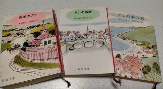線画や色数は違うけど、昭和~平成にかけて長きに渡り発売されていた(のだと思う)、 村岡花子さん訳・赤毛のアンシリーズ(新潮文庫)旧ジャケットのイメージ と似てるなぁ…もしかしたらオマージュなのかも。(妹談)